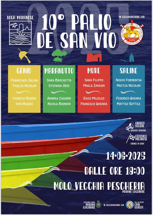 Sabato 14 giugno 2025, alle ore 18.00, presso il Molo della Vecchia Pescheria di Marano Lagunare, si svolgerà il "10° Palio De San Vio".