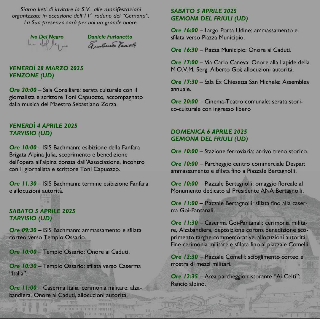 La Sezione ANA di Gemona e l’associazione “Mai Daur”, in collaborazione con le Amministrazioni Comunali di Tarvisio e di Gemona del Friuli e la Comunità di Montagna del Gemonese organizzano l' 11º raduno del Battaglione Alpini Gemona, che si terrà a Tarvisio e a Gemona del Friuli.