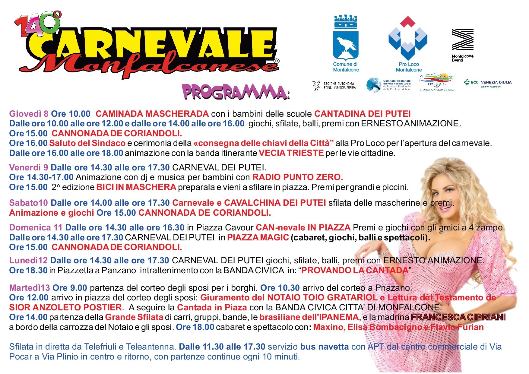dalle 14.00: partenza da Via Matteotti del 140° Carnevale Monfalconese con la Grande Sfilata di carri allegorici, gruppi mascherati e bande musicali.