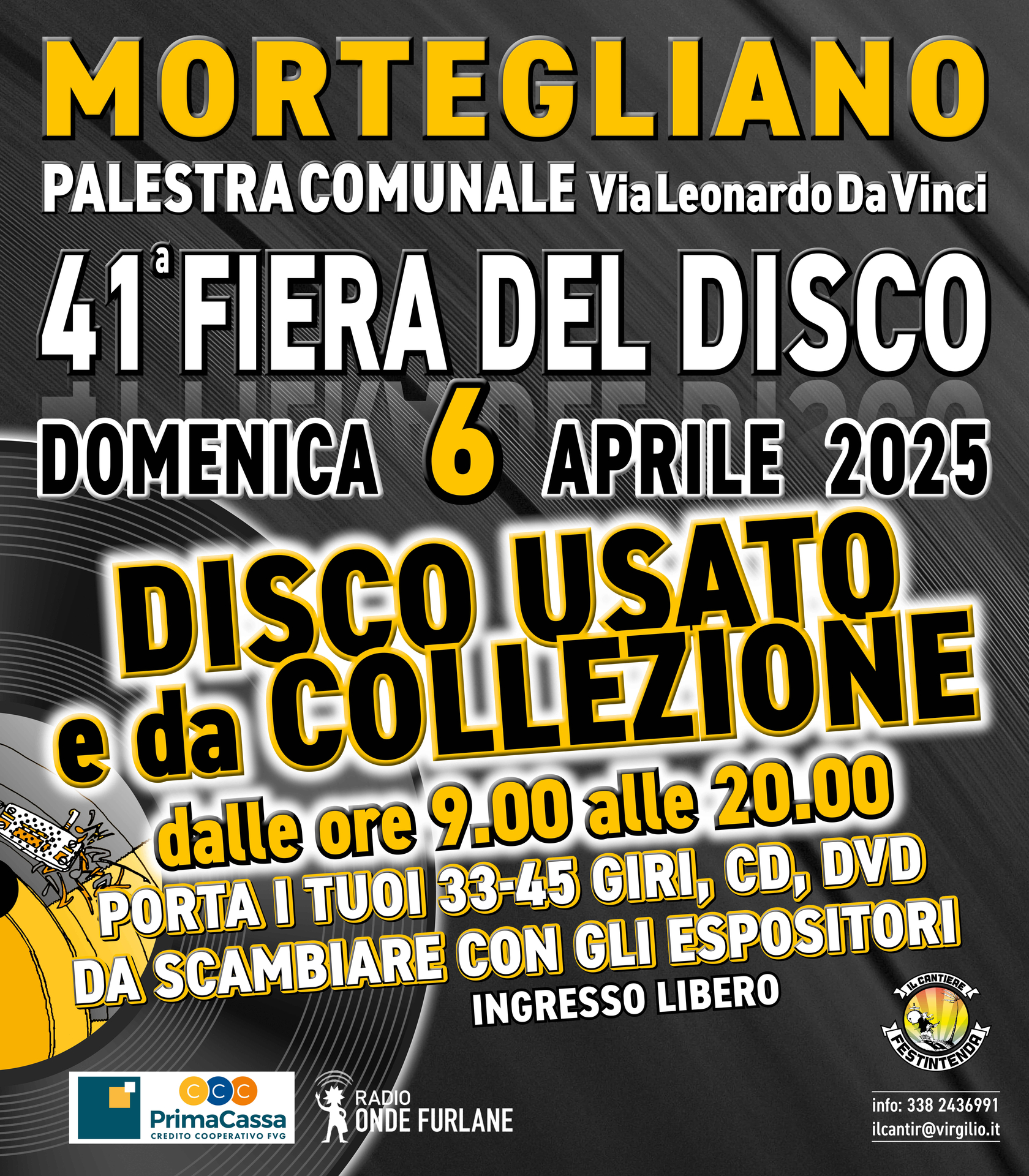 La 41° edizione della "Fiera del disco" di Mortegliano (UD), si terrà presso la Palestra Comunale di Via Leonardo da Vinci domenica 06 aprile 2025 con decine di espositori provenenti da Triveneto, Austria, Slovenia e Croazia.