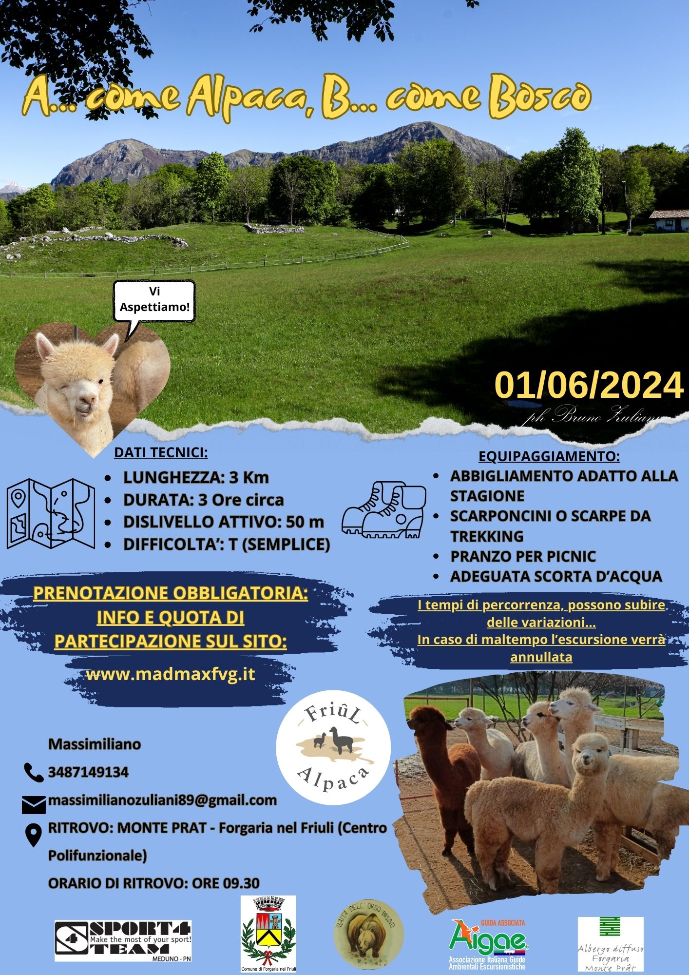 L'itinerario si svolge su un percorso ad anello che si snoda tra i boschi ed i pascoli dell'altipiano di Monte Prat. L'escursione sarà l'occasione per comprendere come si articola la vita in un piccolo bosco montano e di come esso sia popolato dagli animali. Dopo averlo attraversato si giunge ad un bellissimo pascolo dove ad attenderci ci saranno gli alpaca, animali esotici ma molto simpatici, con i quali fare amicizia e passare del tempo assieme. Seguirà picnic con vista sulle bellissime spianate del Tagliamento e dell'Arzino. Faremo poi una tappa presso una delle ultime stalle in attività. Concluderemo il giro rientrando al punto di partenza.
