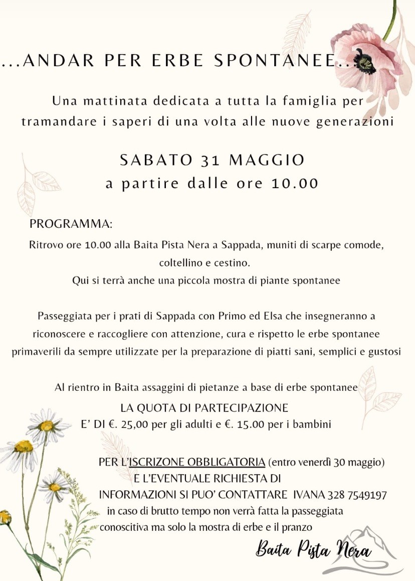 Passeggiata per i prati di Sappada con Primo ed Elsa che insegneranno a riconoscere e raccogliere con attenzione, cura e rispetto le erbe spontanee primaverili da sempre utilizzate per la preparazione di piatti sani, semplici e gustosi.