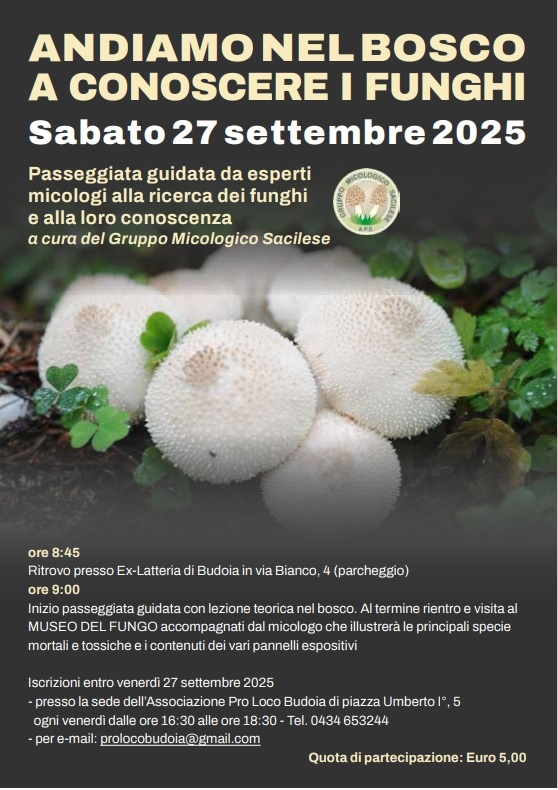 Escursione alla scoperta dei funghi della Pedemontana. Passeggiata nel bosco organizzata in collaborazione col Gruppo Micologico Sacilese e con la Pro Loco di Budoia per conoscere i funghi.