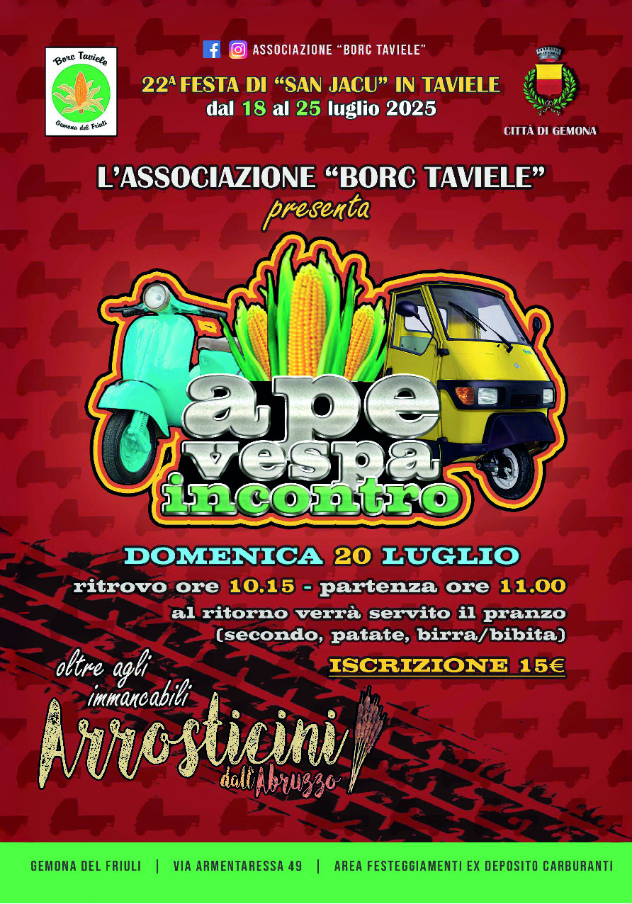 Domenica 20 luglio non perderti l'Ape-Vespa incontro organizzato dall'Associazione "Borc Taviele" in occasione della 22^ Festa di "San Jacu"!
