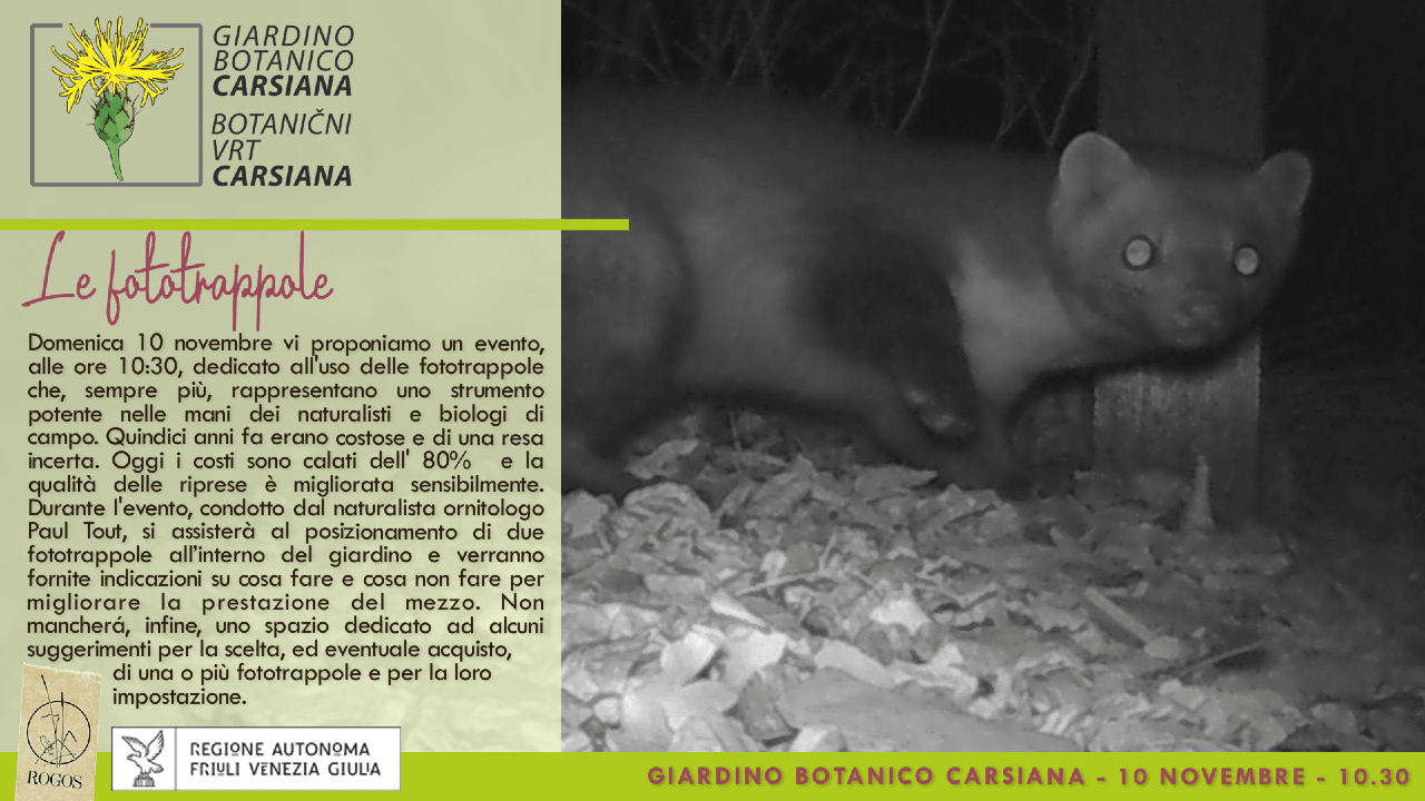 Per l'occasione sarà organizzato un evento, alle ore 10:30, dedicato all'uso delle fototrappole che, sempre più, rappresentano uno strumento potente nelle mani dei naturalisti e biologi di campo. Durante l'evento, condotto dal naturalista ornitologo Paul Tout, si assisterà al posizionamento di due fototrappole all’interno del giardino e verranno fornite indicazioni su cosa fare e cosa non fare per migliorare la prestazione del mezzo. Non mancherá, infine, uno spazio dedicato ad alcuni suggerimenti per la scelta, ed eventuale acquisto, di una o più fototrappole e per la loro impostazione.