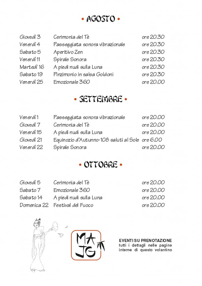 Il "My August Japanese Garden" (MAJG) è un curatissimo microcosmo di 1600 mq, composto da un minuzioso sistema di sentieri, stagni con le iconiche carpe Koi e giardini zen, che apre al pubblico solo in occasioni speciali. Ivan Pressi, l’Art Designer che lo ha creato, ci aiuterà ad osservare che nessun elemento è posto in maniera casuale, ma tutto interviene a creare l’atmosfera tipica dei giardini del Sol Levante. In due appuntamenti nell’arco della giornata la visita sarà corredata da un evento speciale: il Kodō, ovvero la cerimonia giapponese dell’ascolto dell’incenso: vengono riscaldati dei preziosi legni aromatici che nel rilasciare le loro fragranze, attraverso il tenue fumo che viene sprigionato, diventano oggetto di suggestione e contemplazione. Questa cerimonia viene considerata in Giappone una delle tre arti classiche di raffinatezza, insieme all’Ikebana dedicata alla composizione floreale e al Chado per il tè.