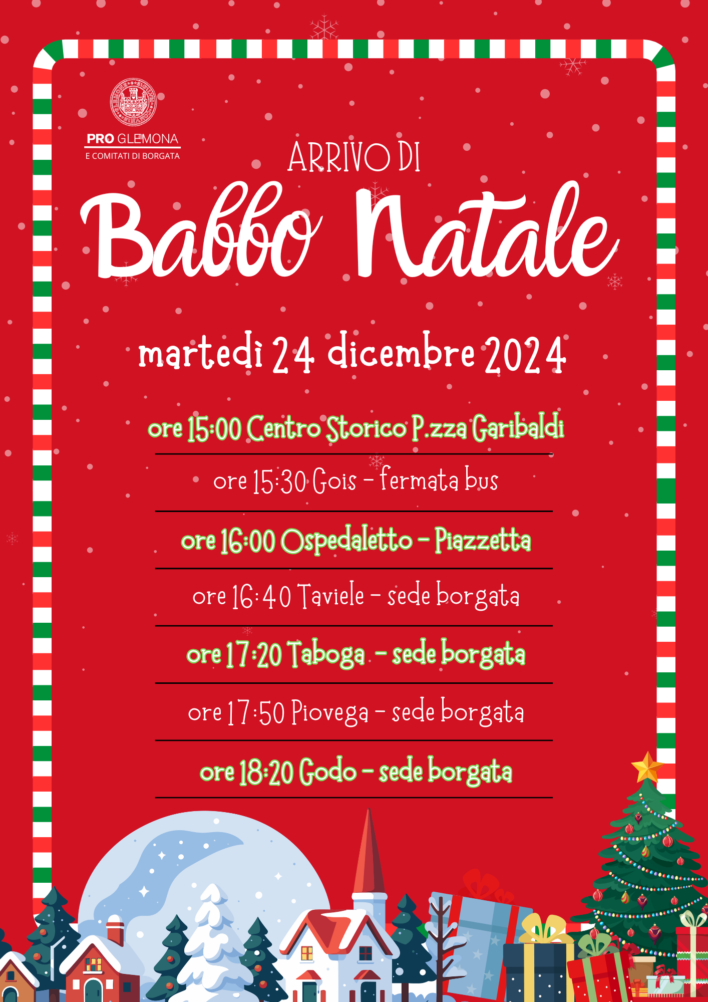 Come da tradizione, anche quest'anno, il 24 dicembre Babbo Natale e i suoi aiutanti passeranno col loro immancabile carro musicale a trovare i bambini delle borgate di Gemona!