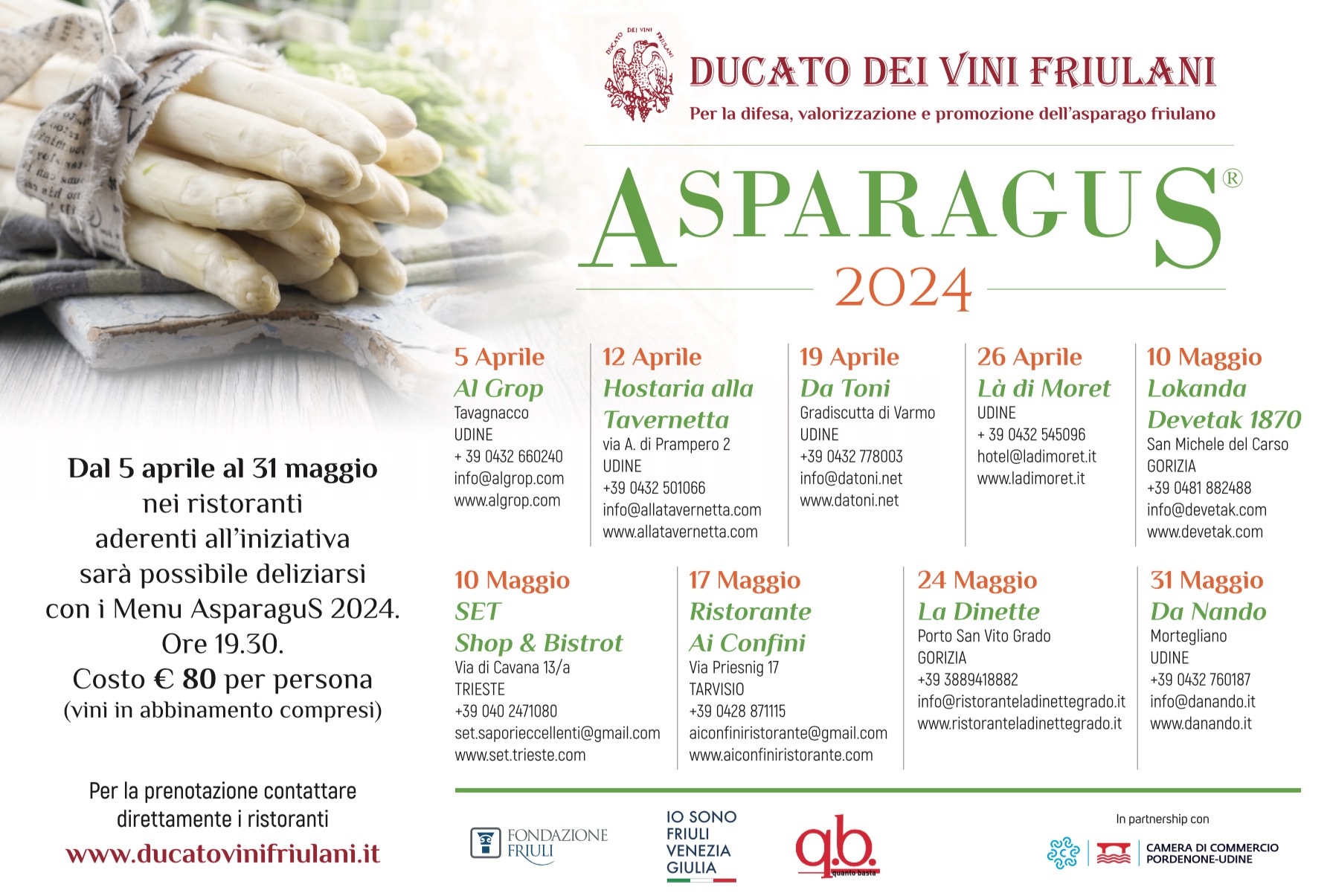 Quest’anno si apre con la novità di due nuovi ristoranti inseriti nel circuito Asparagus: Ai Confini a Tarvisio e SET & Shop Bistrot a Trieste, che si vanno ad aggiungere agli storici ristoranti: Al Grop di Tavagnacco, Là di Moret a Udine, Hosytaria alla Tavernetta a Udine, Lokanda Devetak a San Michele del Carso, Da Nando a Mortegliano, La Dinette a Grado e Da Toni a Gradiscutta di Varmo.