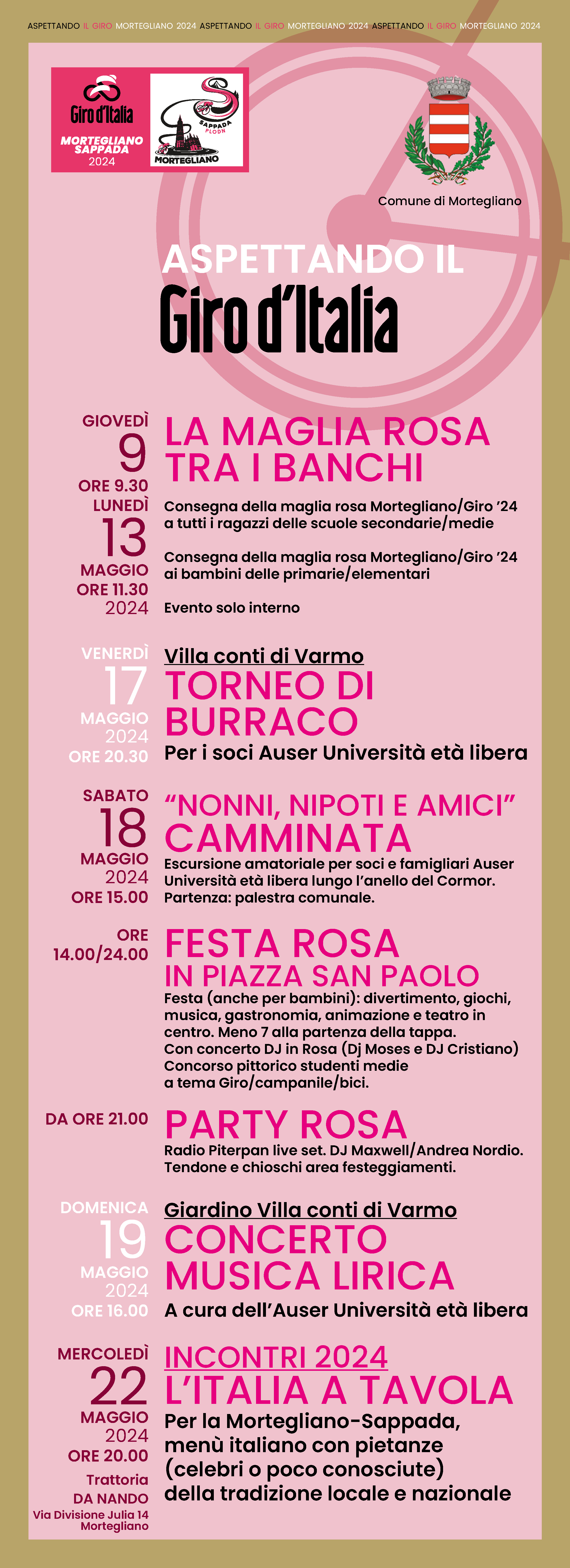 Dal 9 al 22 maggio 2024 nuovi eventi per celebrare il Giro d'Italia, il quale parte da Mortegliano il 24 maggio 2024