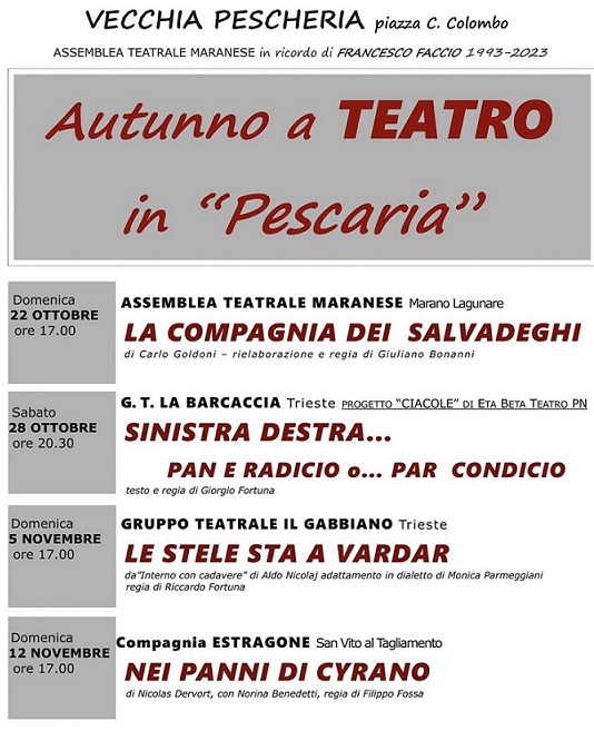 Rassegna autunnale con 4 spettacoli in Pescaria Vecia a Marano Lagunare. Secondo appuntamento sabato 28 ottobre con il G.T. La Barcaccia di Trieste in "Sinistra Destra... pan e radicio o ... par condicio". Testo e regia di Giorgio Fortuna.