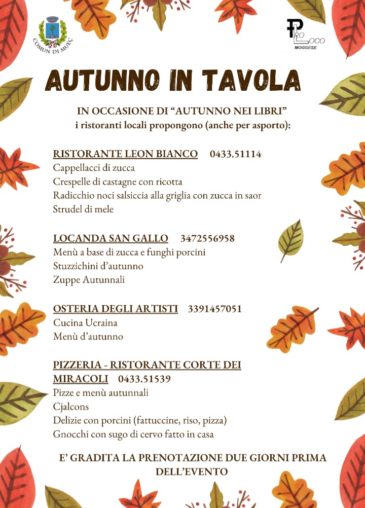 I ristoranti di Moggio Udinese dal 1 ottobre al 29 novembre, in occasione della rassegna "Autunno nei Libri", propongono menù tipici del periodo, E' gradita la prenotazione due giorni prima dell'evento. I menù vengono proposti anche per asporto.