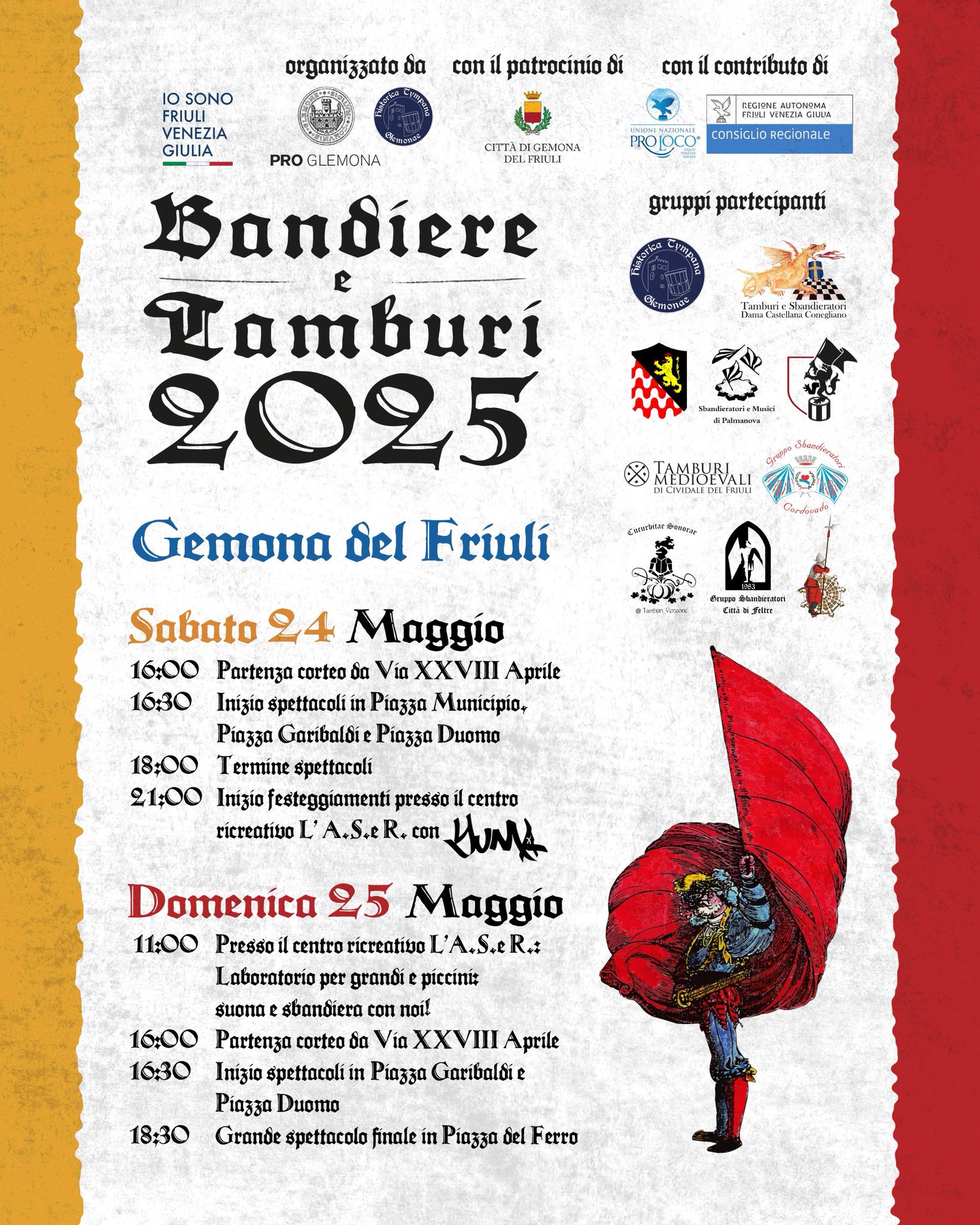 10 gruppi di musici e sbandieratori provenienti dal triveneto con più di 150 figuranti per due giorni di spettacoli nel cuore di Gemona del Friuli.
