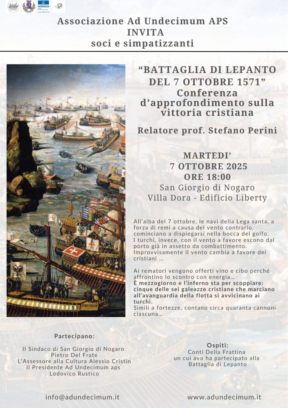 Martedì 7 ottobre 2025, alle ore 18.00, presso la Sala Liberty di Villa Dora di San Giorgio di Nogaro, si terrà la conferenza d'approfondimento sullla vittoria cristiana in riferimento alla "Battaglia di Lepanto del 7 ottobre 1571". Relatore: Prof. Stefano Perini.
