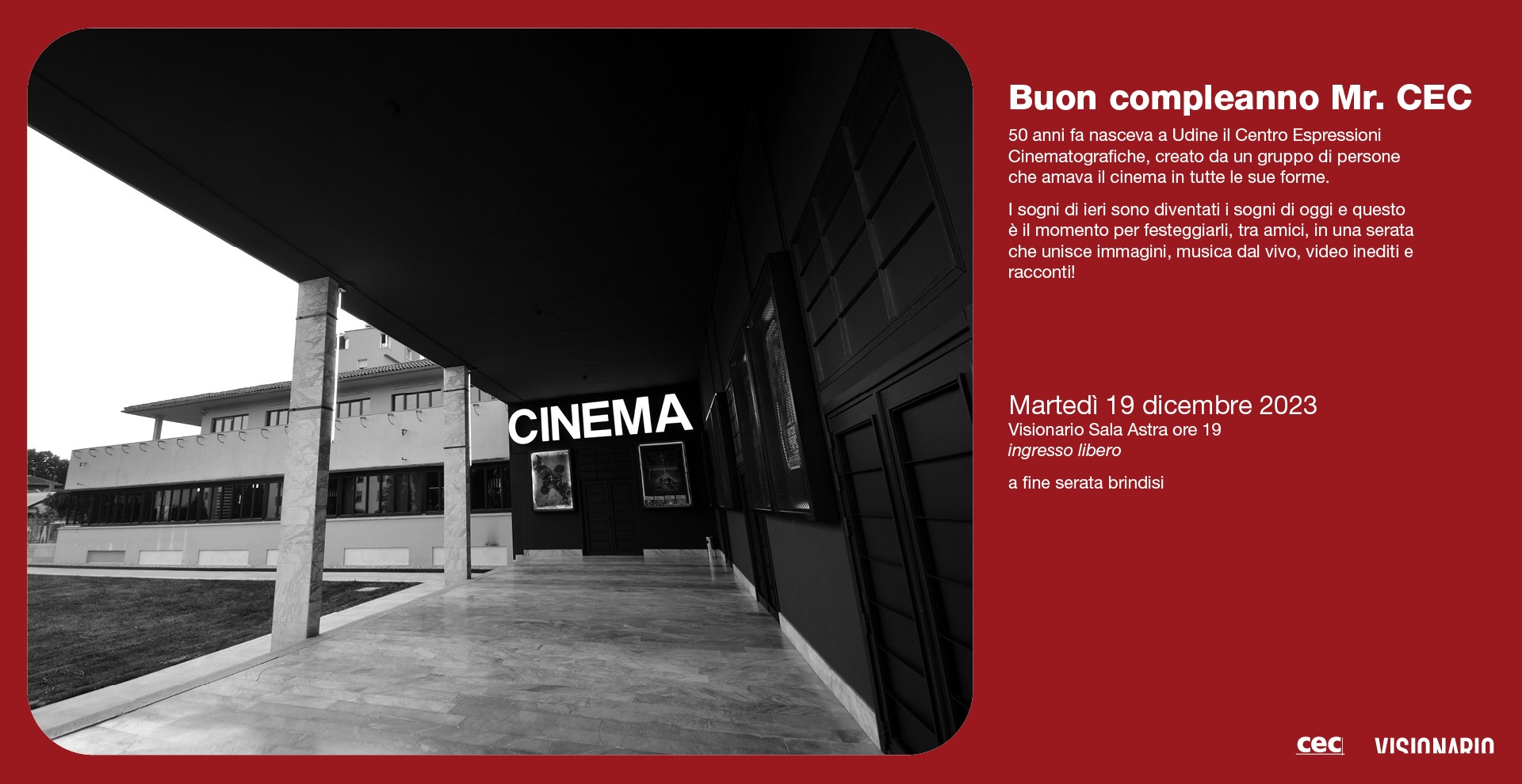 50 anni fa, per l’esattezza il 1º luglio 1973, nasceva a Udine il CEC - Centro Espressioni Cinematografiche, creato da un gruppo di persone che amava il cinema in tutte le sue forme. Un vero manipolo di cinefili che ha poi portato avanti, nell’arco del tempo, un’idea fortemente progettuale e lungimirante della cultura cinematografica. Il CEC ha creato e gestito la prima sala d’essai della città, il mitico Ferroviario, dalle cui radici ha preso vita il Visionario. E proprio al Visionario, martedì 19 dicembre, si farà festa!