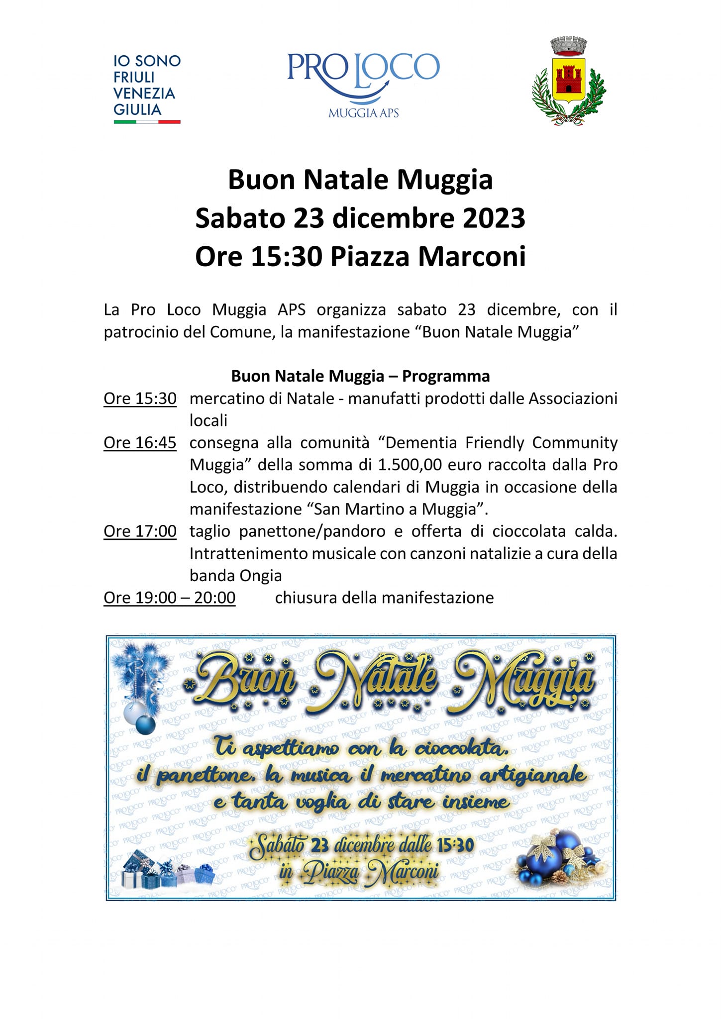 Sabato 23 dicembre 2023 dalle 15.30 in Piazza Marconi a Muggia, si terrà uno speciale evento per celebrare tutti assieme il Natale e farsi gli auguri, a cura di Pro Loco Muggia APS.
