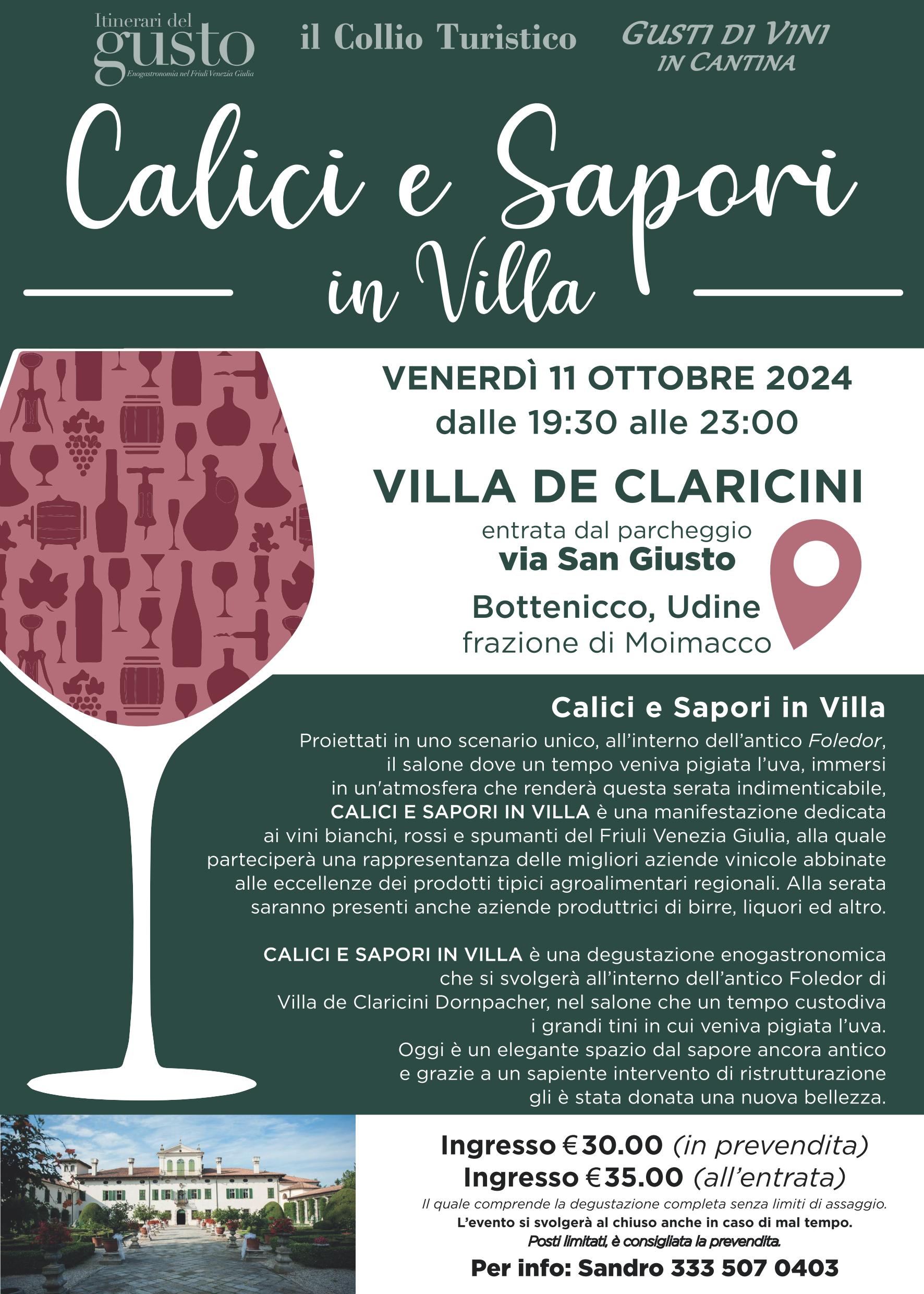 Proiettati in uno scenario unico, all’interno dell’antico Foledor, il salone dove un tempo veniva pigiata l’uva, immersi in un'atmosfera che renderà questo serata indimenticabile, CALICI E SAPORI IN VILLA è una manifestazione dedicata ai vini bianchi, rossi e spumanti del Friuli Venezia Giulia alla quale parteciperà una rappresentanza delle migliori aziende vinicole abbinate alle eccellenze dei prodotti tipici agroalimentari regionali. Alla serata saranno presenti anche aziende produttrici di birre, liquori ed altro.