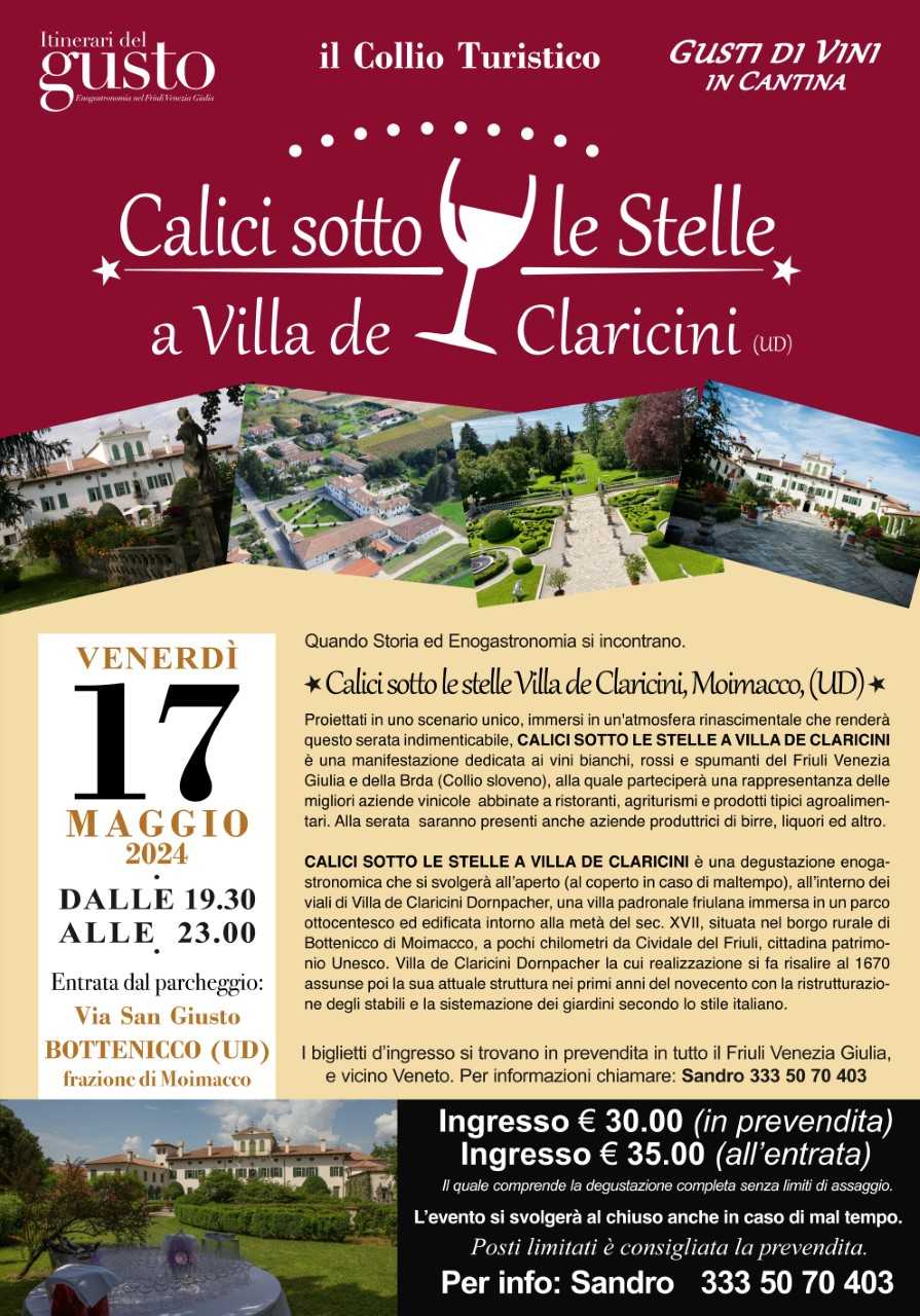 CALICI SOTTO LE STELLE A VILLA DE CLARICINI è una manifestazione dedicata ai vini bianchi, rossi e spumanti del Friuli Venezia Giulia e della Brda (Collio sloveno), alla quale parteciperà una rappresentanza di 25/30 tra le migliori aziende vinicole abbinate a ristoranti, agriturismi e prodotti tipici agroalimentari. Alla serata saranno presenti anche aziende produttrici dii birre, liquori ed altro.