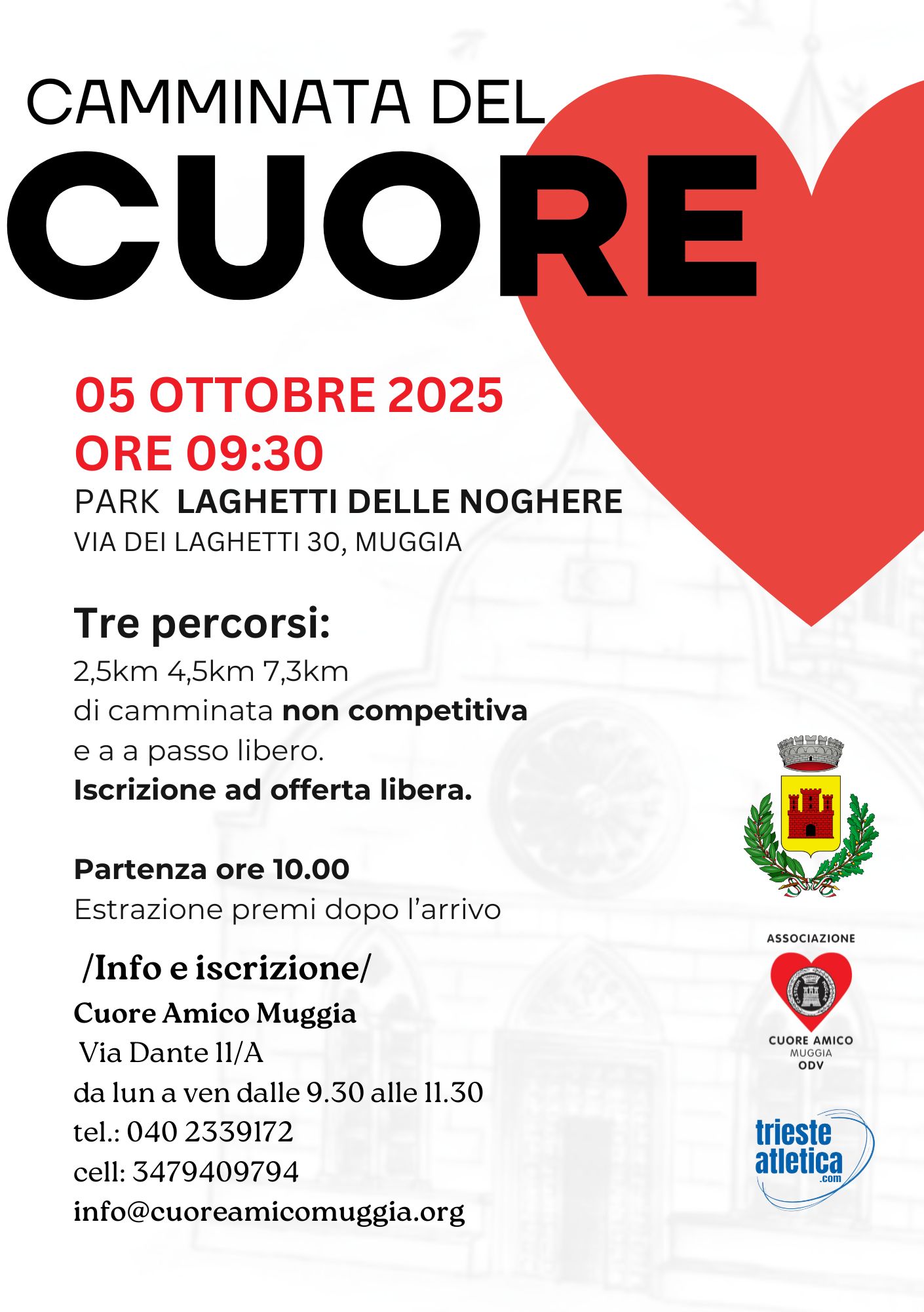 Per l'occasione domenica 5 ottobre 2025 alle ore 9.30 avrà luogo la "Camminata del Cuore", Park Laghetti delle Noghere, Via dei Laghetti 30 a Muggia. Partenza ore 10.00, estrazione dei premi dopo l'arrivo.