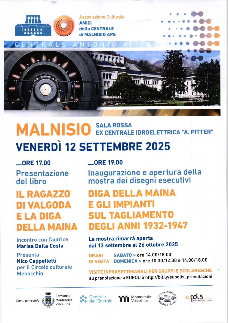L'Associazione Culturale Amici della Centrale di Malnisio ha organizzato, presso al Sala Rossa della ex Centrale ldroelettrica di Malnisio "A. Pitter", I'incontro con Marisa Dalla Costa autrice del libro "Il ragazzo di Valgoda e la diga della Maina".