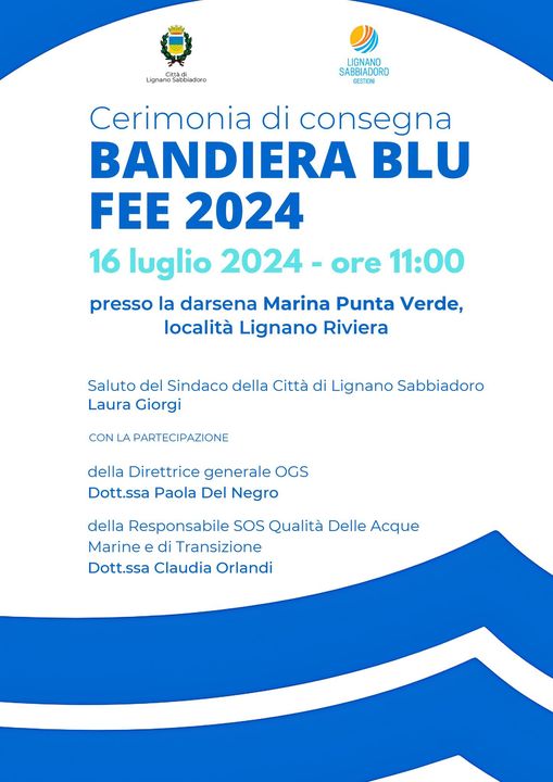 Martedì 16 Luglio 2024 si svolgerà la Cerimonia di Consegna della Bandiera Blu Fee 2024, presso la Darsena Marina Punta Verde, nella località di Lignano Riviera.