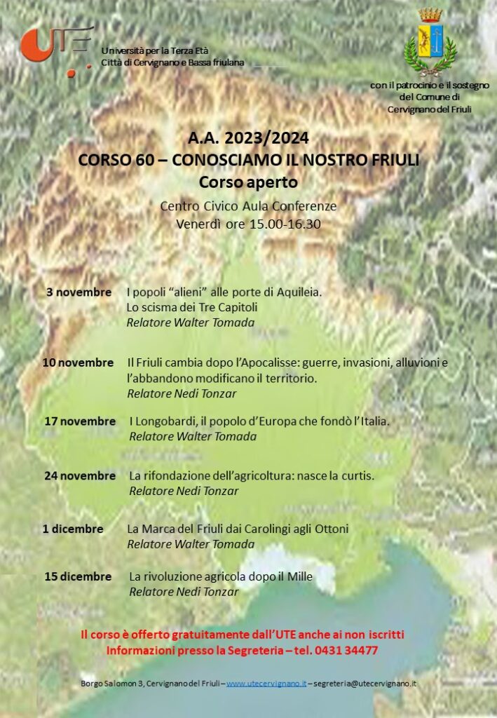 Storia della nostra Regione dall’arrivo di nuovi popoli alle porte di Aquileia fino alle origini del Patriarcato. Il clima e le trasformazioni in quei secoli nel territorio e nell’agricoltura.