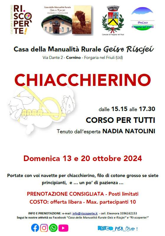 Domenica 13 e 20 ottobre 2024 Portate con voi navette per chiacchierino, filo di cotone grosso se siete principianti, e … un po’ di pazienza …