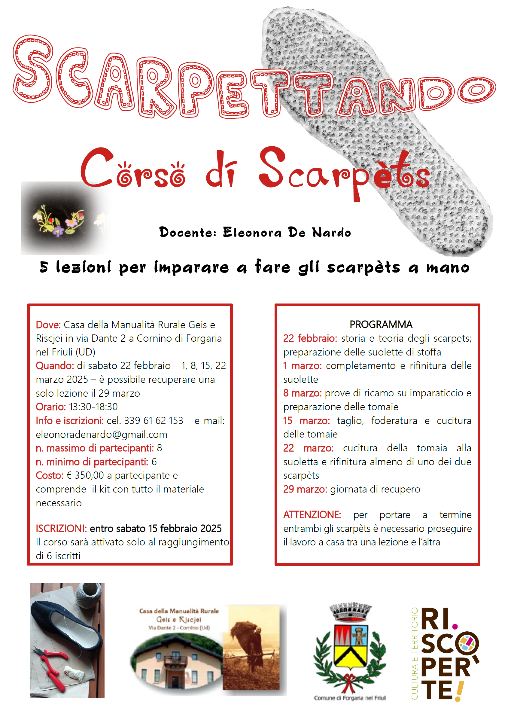 Durante le lezioni si imparerà, passo a passo, come fare un paio di scarpets completamente a mano, ad eccezione del tallone che sarà cucito a macchina, proprio come facevano una volta partendo dal riciclaggio dei tessuti per la suoletta.