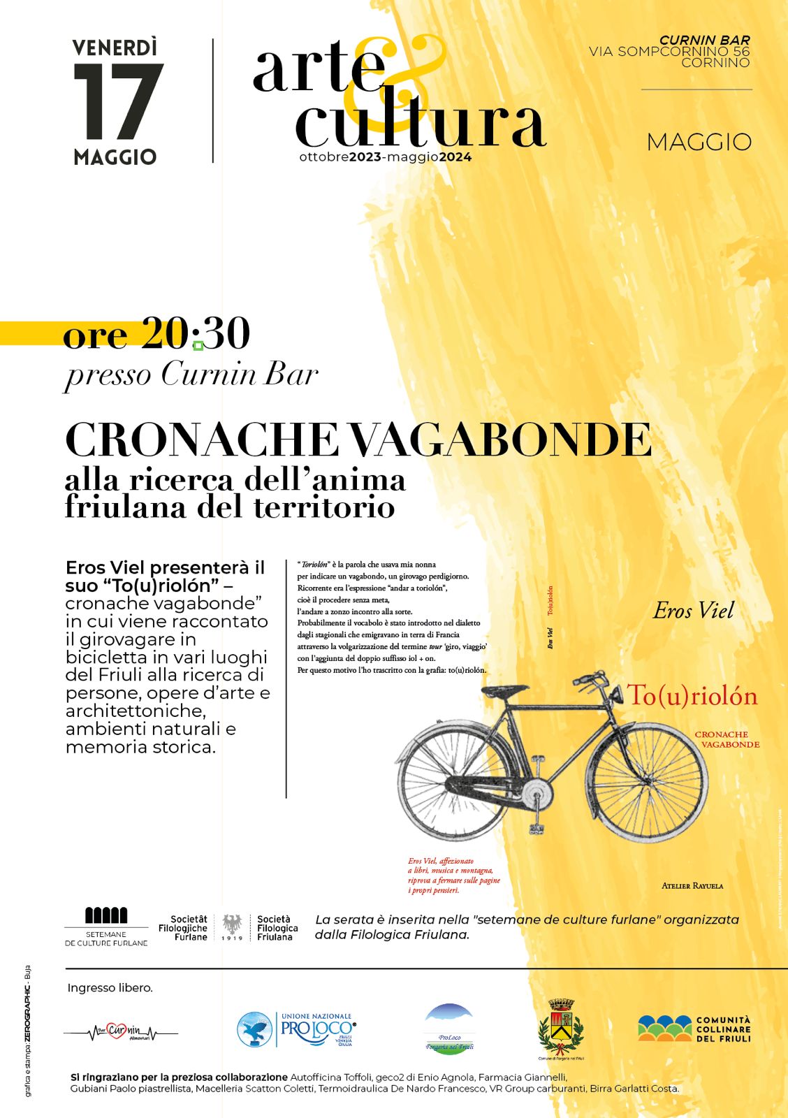 Al “Curnin Bar” a Cornino, venerdì 17 marzo alle ore 20:30, Eros Viel presenterà il suo “To(u)riolón” – cronache vagabonde” in cui viene raccontato il girovagare in bicicletta in vari luoghi del Friuli alla ricerca di persone, opere d’arte e architettoniche, ambienti naturali e memoria storica.