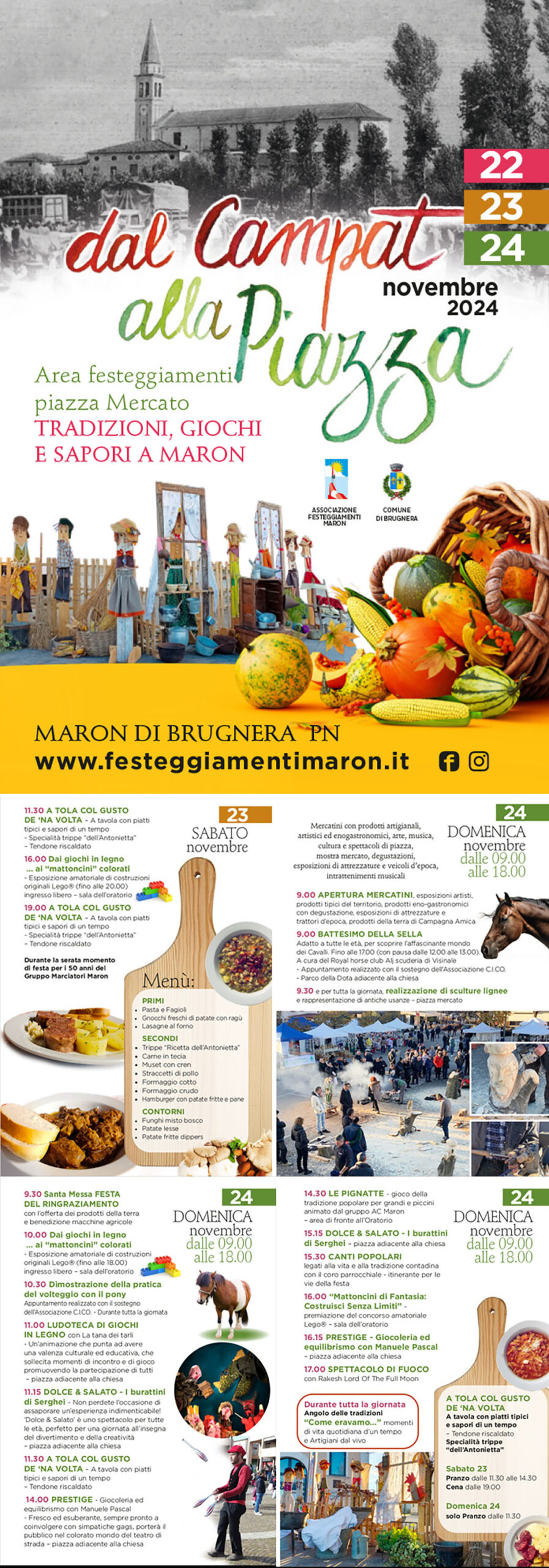 Lungo la via centrale del paese, alla riscoperta della cucina di un tempo, tra vecchi mestieri, giochi popolari e doni della terra. Saranno presenti mercatini con prodotti artigianali, artistici ed enogastronomici, arte, musica, cucina tipica, spettacoli in strada, scultori del legno, esposizioni di attrezzature e veicoli d’epoca, una mostra di mattoncini Lego, tante attività per bambini tra cui il battesimo della sella, spettacoli di magia, incontri culturali e tanto altro.