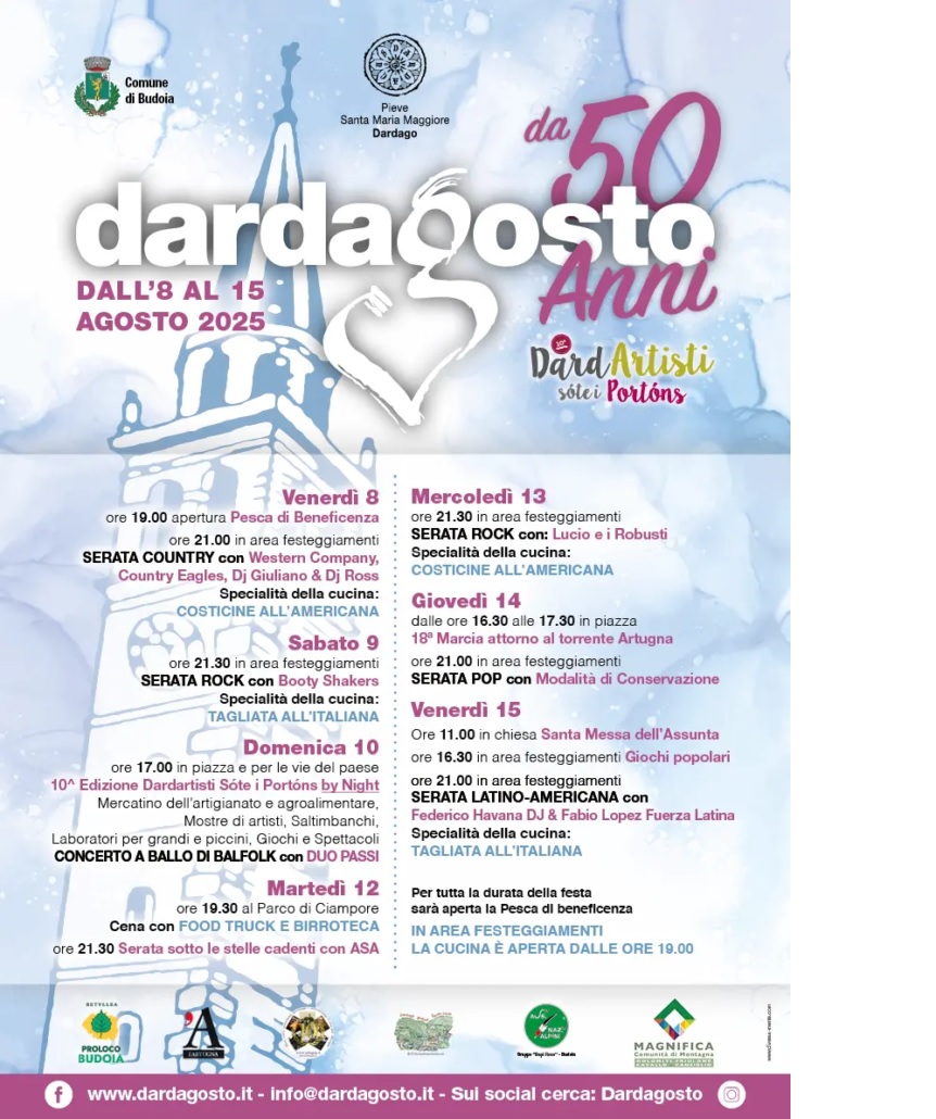 La Festa del Dardagosto presente sul territorio da oltre 40 anni, vi darà l’opportunità di scoprire il nostro paese e assaporare le nostre pietanze (il chiosco è aperto tutte le sere, tranne martedì 12 agosto quando la festa si sposterà al parco di Ciampore). Animeremo le serate con colori, suoni e sorprese, rendendo l’estate ancora più speciale.