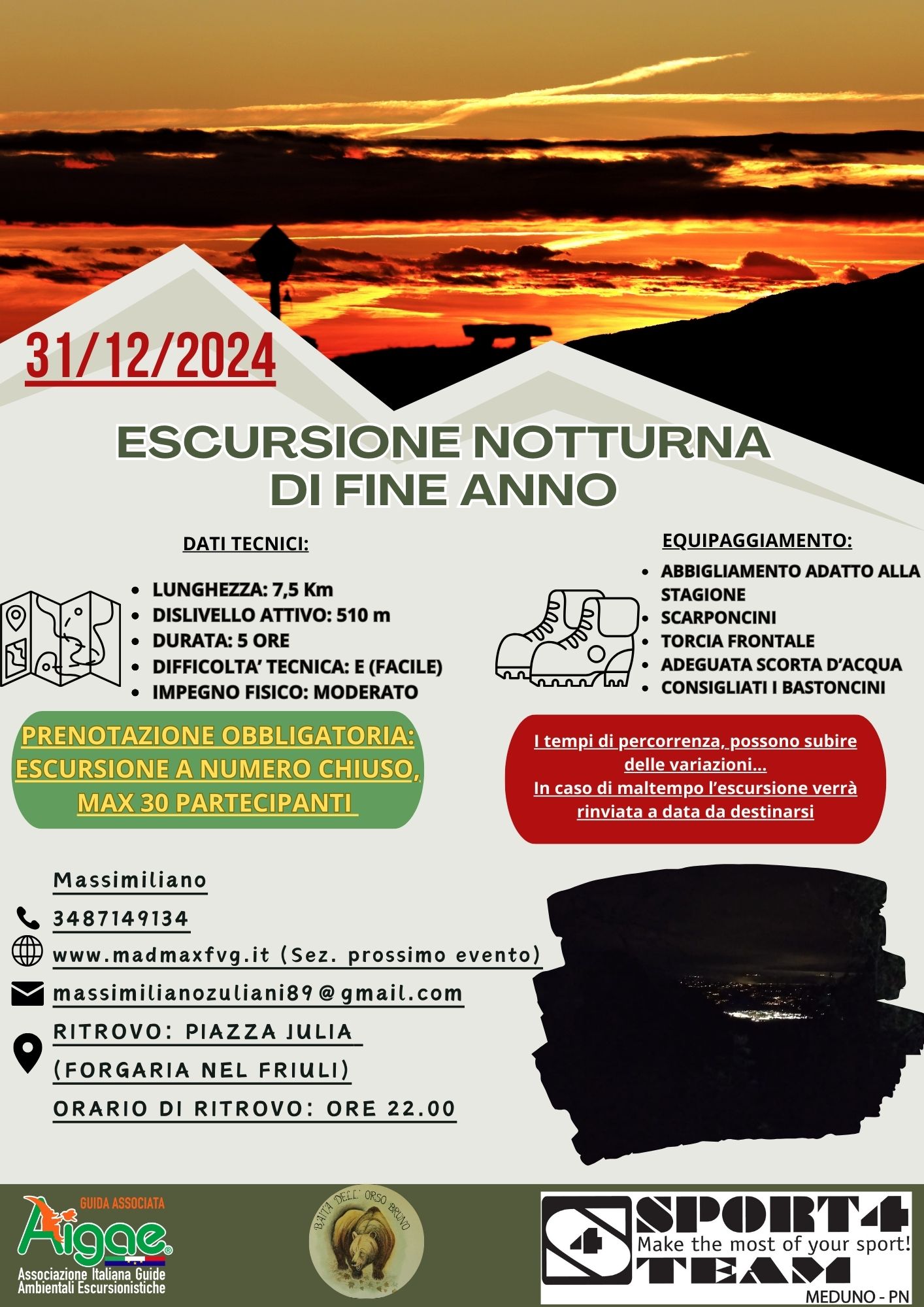 La sera di capodanno viene proposta un'escursione in notturna da Forgaria a Monte Prat, con un brindisi benaugurante con una splendida vista panoramica sul Friuli!
