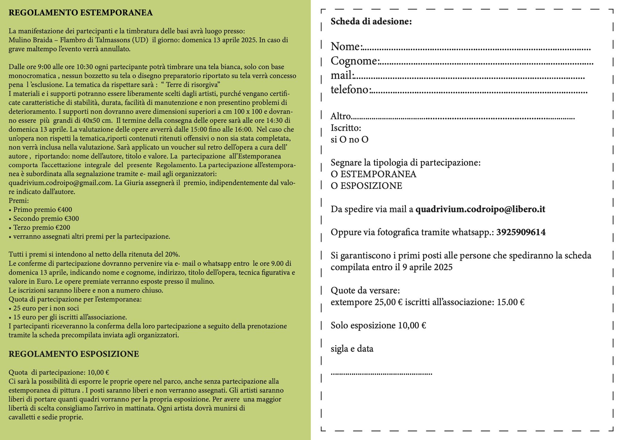 Un'esplosione di colori e creatività animerà il suggestivo Mulino Braida, nel cuore del biotopo di Flambro nel comune di Talmassons, in occasione dell'Estemporanea di Pittura che si terrà domenica 13 aprile 2025 dalle ore 10.00 alle ore 15.00.