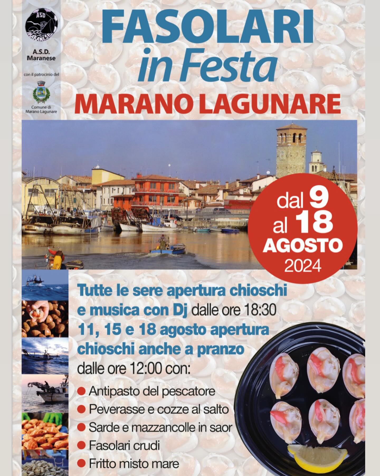 Dal 9 al 18 agosto 2024, le vie di Marano Lagunare ospiteranno la Festa dei Fasolari, dieci giorni dedicati all'enogastronomia locale e ai concerti di musica dal vivo.