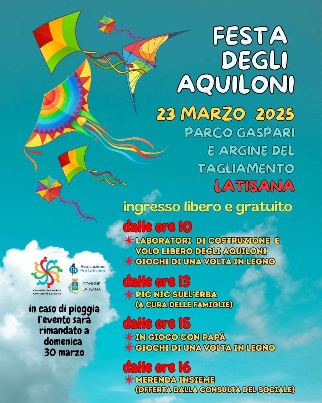 Quarta edizione della Festa degli Aquiloni, che ogni anno riscuote un grande successo fra le famiglie, riempiendo di aquiloni sia il Parco cittadino che il lungofiume del Tagliamento, consentendo il riutilizzo degli involucri delle uova di Pasqua, raccolti presso le scuole del territorio, per creare coloratissimi aquiloni che genitori e bambini potranno costruire insieme.