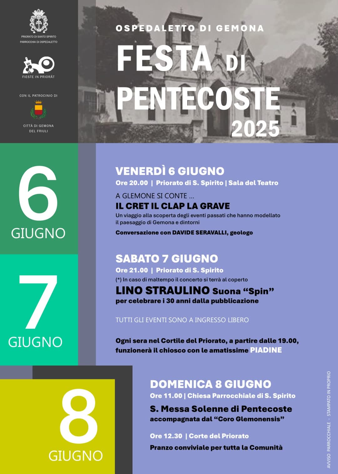In località Ospedaletto la Festa di Pentecoste propone appuntamenti culturali, musicali e celebrazione religiose. Chiosco con specialità gastronomiche.