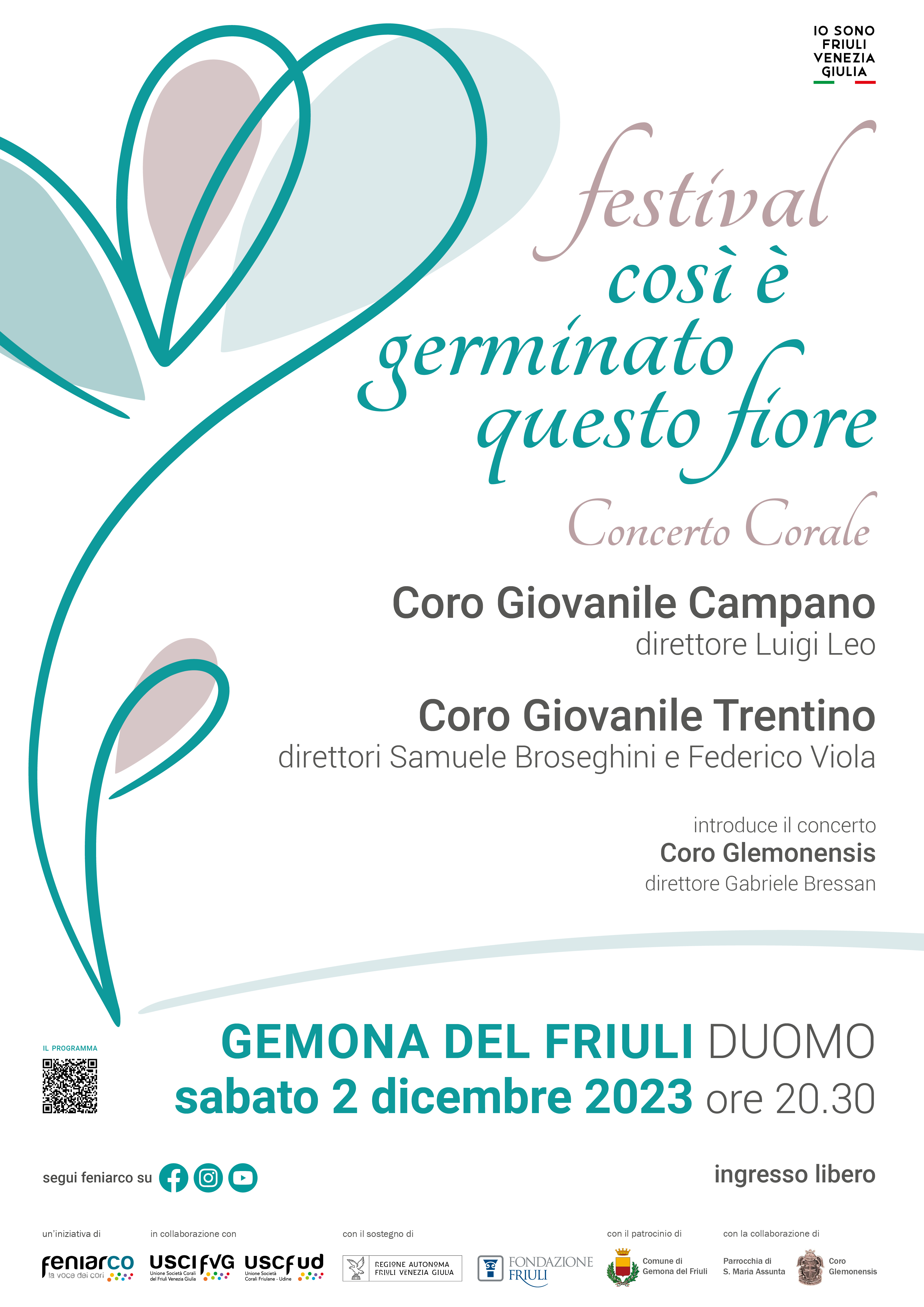 Sabato 2 dicembre alle 20:30 il Duomo di Gemona ospiterà un appuntamento del festival di concerti corali "Così è germinato questo fiore", un'iniziativa di Feniarco - La voce dei cori.