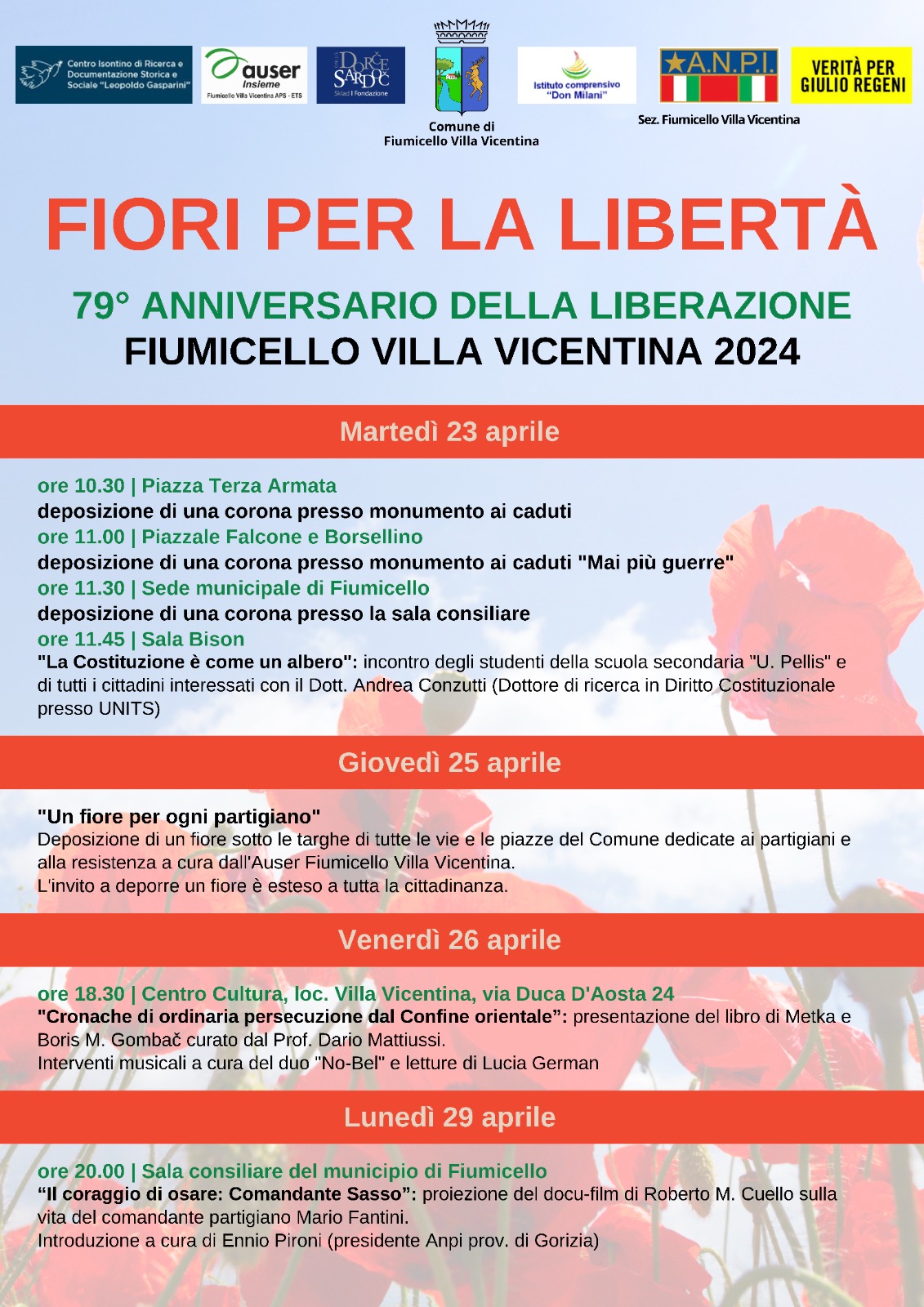 In occasione del 79° anniversario della liberazione dell'Italia dall'occupazione nazifascista, il Comune di Fiumicello Villa Vicentina organizza "Fiori per la Libertà", una rassegna culturale pensata per ricordare tutti coloro che, anche al costo della propria vita, hanno ridato libertà e dignità al nostro Paese e per insegnare ai nostri ragazzi e alle nostre ragazze quelle che sono le radici delle nostra Costituzione.