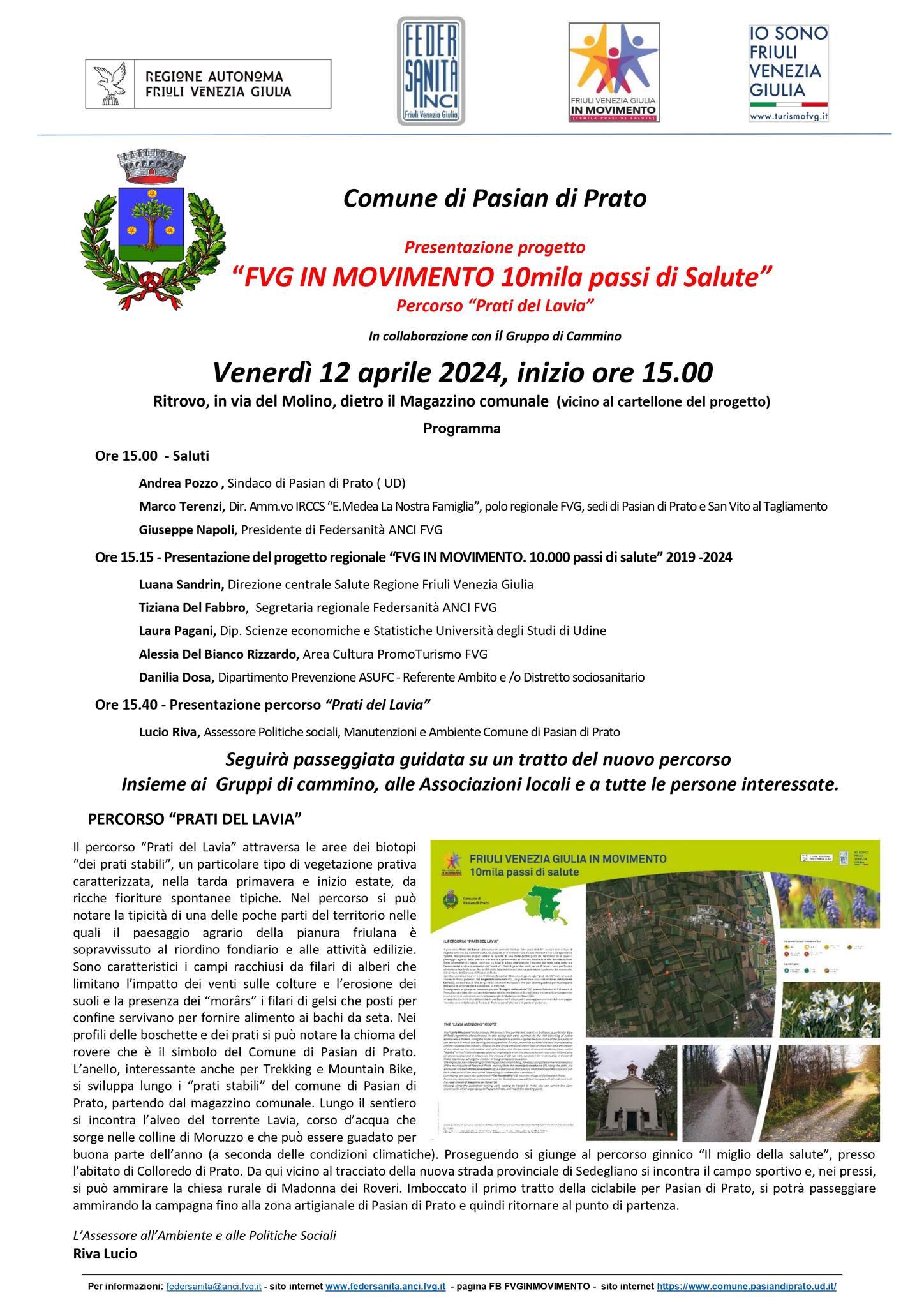 In questa giornata verrà presentato il progetto "FVG IN MOVIMENTO 10 000 passi di salute" 2019-2024 e la presentazione del percorso "Prati di Lavia".