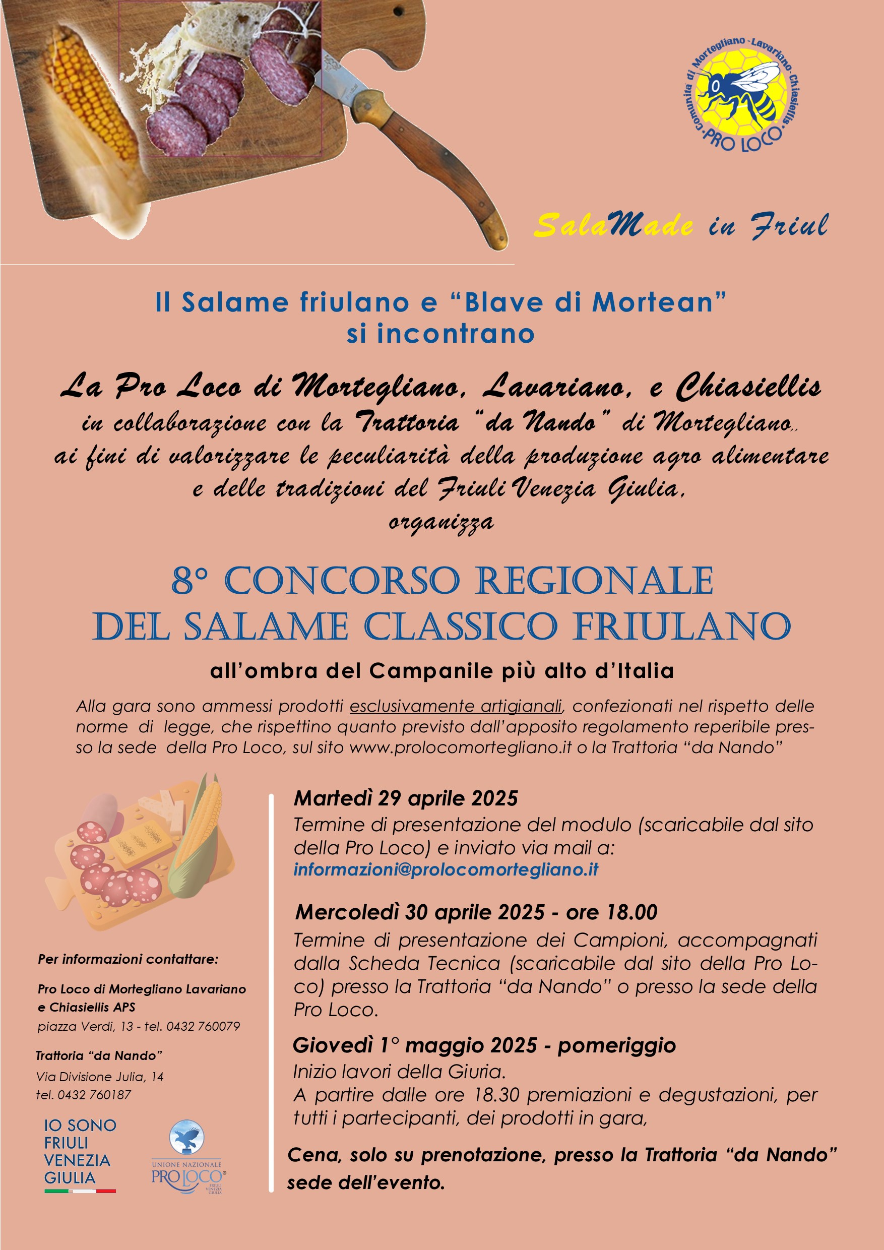 La Pro Loco di Mortegliano Lavariano e Chiasiellis organizza la 8^ edizione della Gara del Salame classico friulano che avrà luogo giovedì 1 maggio 2025 presso la Trattoria ''Da Nando'' di Mortegliano alle ore 18:30.