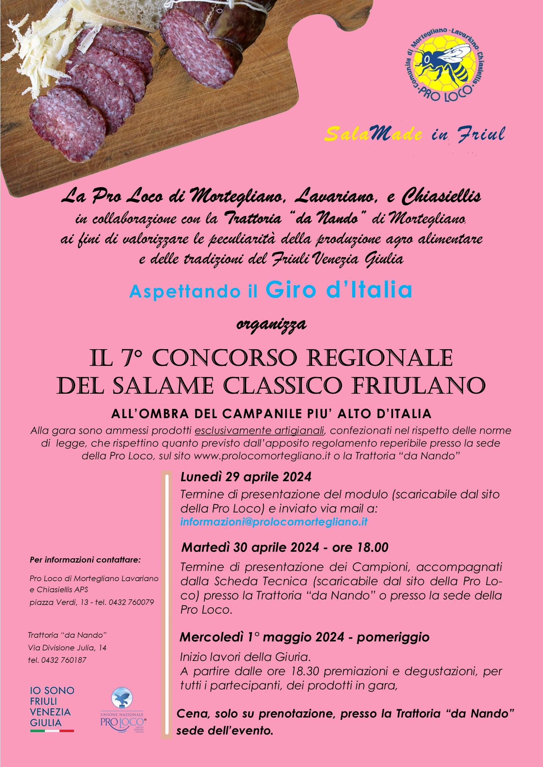 La Pro Loco di Mortegliano Lavariano e Chiasiellis organizza, in attesa del Giro d'Italia, la 7^ edizione della Gara del Salame classico friulano che avrà luogo mercoledì 1 maggio 2024 presso la Trattoria ''Da Nando'' di Mortegliano alle ore 18:30