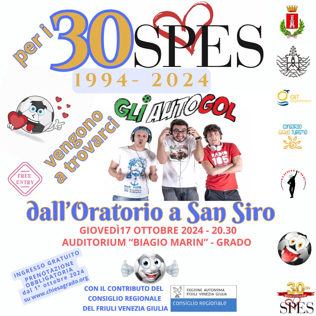 Per festeggiare il 30° anniversario dello Spes, ricreatorio parrocchiale di Grado, don Paolo ha invitato “Gli Autogol” (Michele Negroni, Alessandro Iraci e Alessandro Trolli) che, con l’incontro di giovedì 17 ottobre, inaugureranno i festeggiamenti… “Dall’oratorio a San Siro” (questo il titolo dell’Incontro) sarà un’occasione per sorridere e per conoscere la storia di questi tre amici che in oratorio sono cresciuti e che, anche oggi, ripensano a quelli inizi…