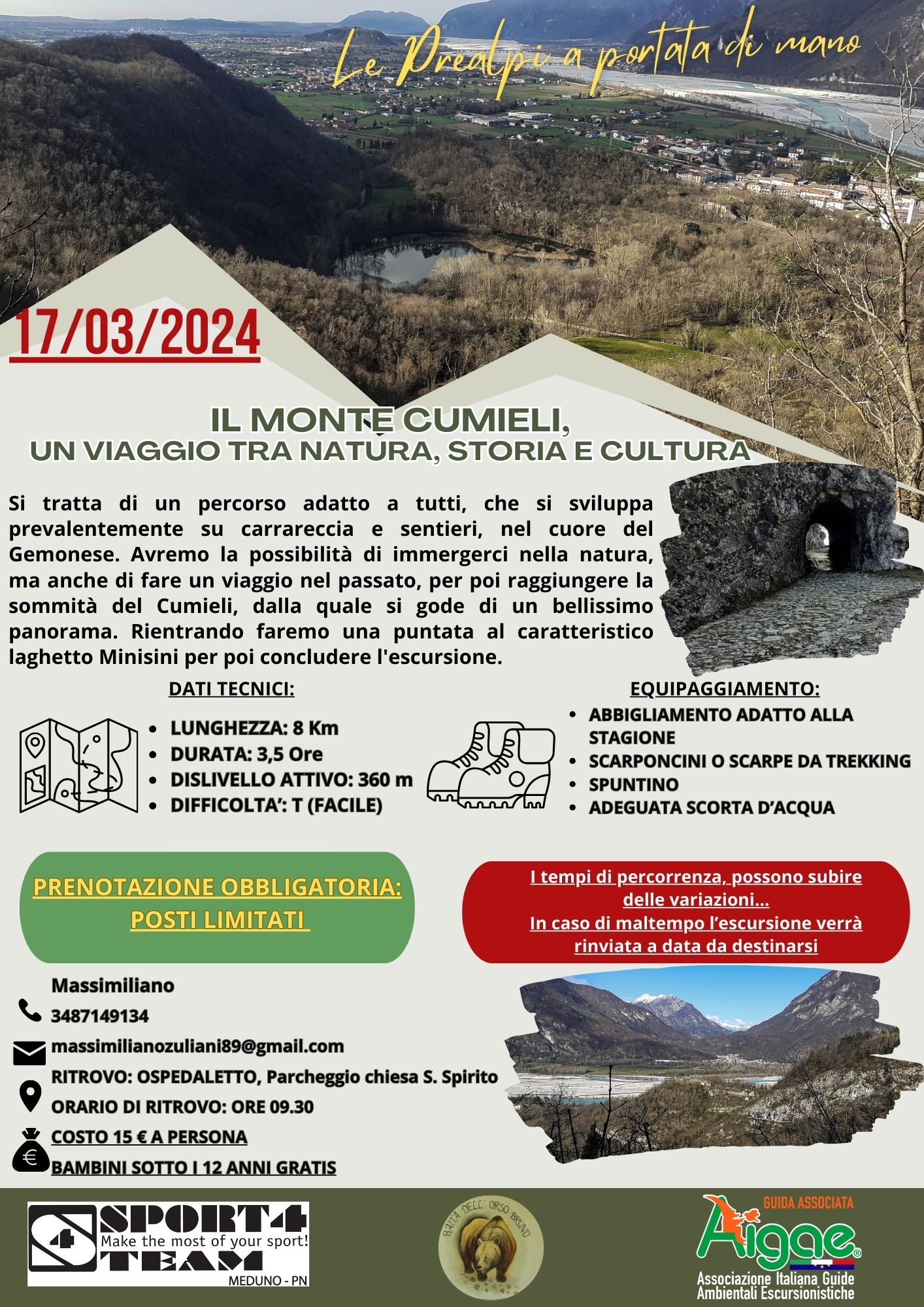 Il 17 marzo 2024, Massimiliano Zuliani una guida ambientale escursionistica del Friuli Venezia Giulia organizza un'escursione guidata sul Monte Cumieli. Essa è un'escursione di facile percorrenza, con dislivello attivo di 360m, di una lunghezza di 8 km e di una durata di 3,5 ore. Ci si ritroverà al parcheggio chiesa S.Spirito verso le ore 9.30