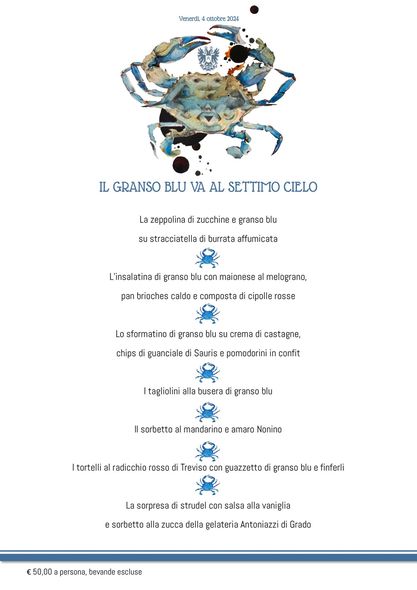 Venerdì 4 ottobre, dalle ore 20:00, il Ristorante Settimo Cielo Vi invita ad un'esperienza culinaria esclusiva: Il Trionfo del Blu, una serata gourmet interamente dedicata al pregiato Granso Blu, ("granchio blu" nel dialetto gradese). Preparate i Vostri sensi ad un viaggio attraverso piatti creativi, accompagnati dai profumi e dai sapori del mare, il tutto immerso nell'atmosfera raffinata ed elegante del nostro ristorante panoramico.