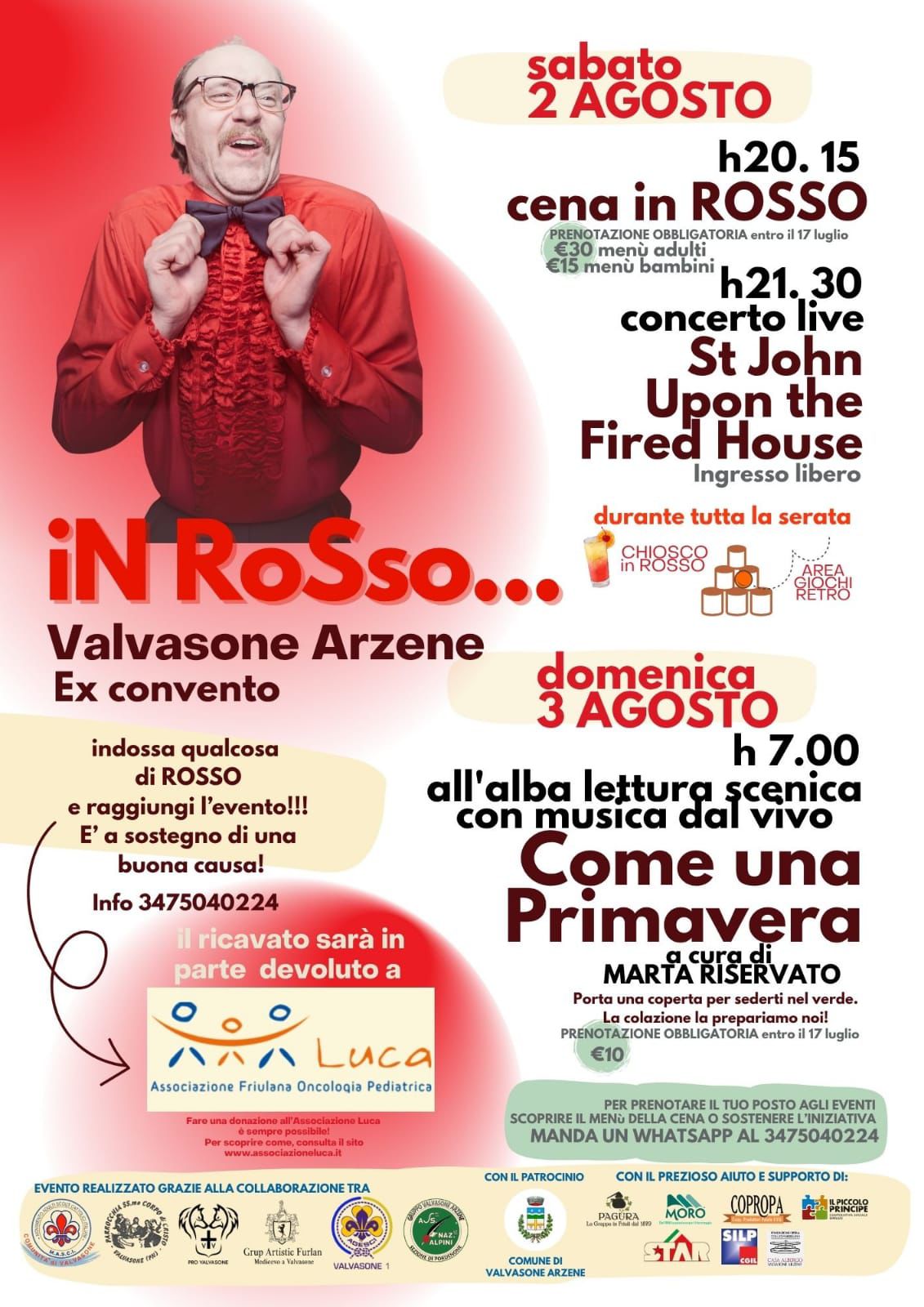 Si parte con la serata di Sabato 2 agosto: cena in rosso su prenotazione, a seguire musica dal vivo con il concerto dei "St. John upon the fired house", il gruppo blues più longevo di Pordenone! Per tutta la serata sarà attivo il chiosco in rosso e presente un'area giochi dedicata ai più piccini.