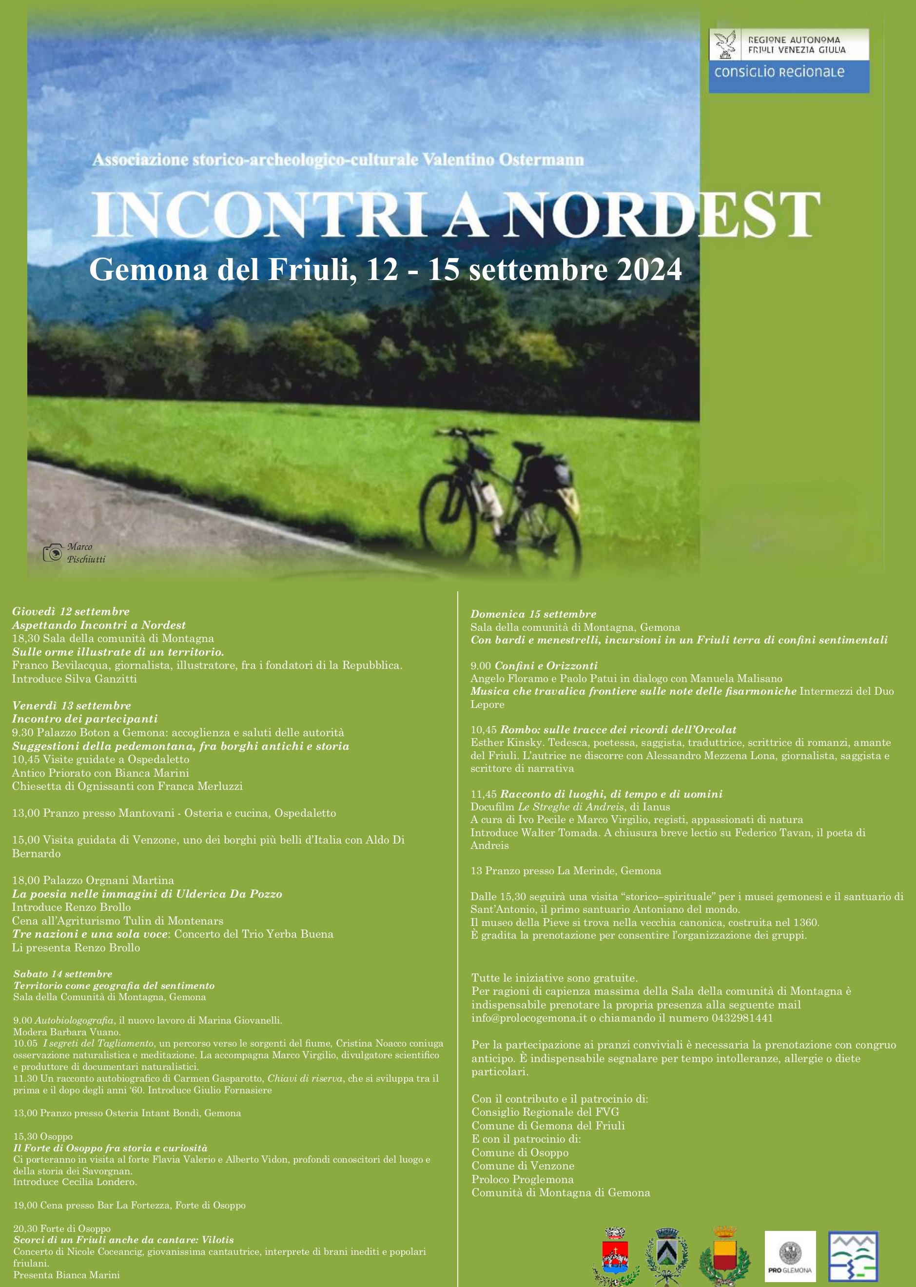 Tutte le iniziative sono gratuite. Per ragioni di capienza massima della Sala della comunità di Montagna è indispensabile prenotare la propria presenza alla seguente mail info@prolocogemona.it o chiamando il numero 0432981441