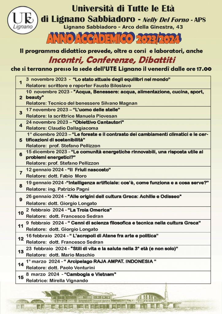 L’Universita di Tutte le Età ha organizzato, come da tradizione, una serie di incontri culturali pomeridiani presso la propria sede in Arco della Ginestra 43 (Lignano Pineta). La partecipazione è ad ingresso libero, aperta a tutti.