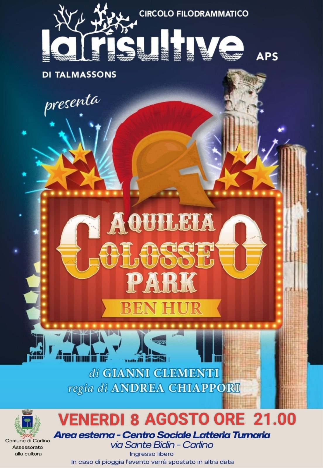 Giovedì 24 luglio, alle ore 21.00, presso l'area esterna del Centro Sociale Latteria Turnaria a Carlino si terrà il primo appuntamento della rassegna "INCONTRI D'ESTATE 2025". Verrà messa in scena, a cura del Circolo Filodrammatico "La Risultive" di Talmassons APS la rappresentazione teatrale "AQUILEIA COLOSSEO PARK - BEN HUR", di Gianni Clementi per la regia di Andrea Chiappori.