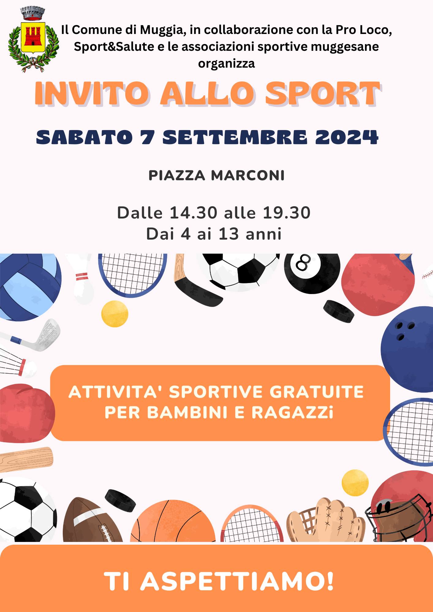 Sabato 7 settembre 2024 torna l'evento “Invito allo Sport”, la manifestazione che consente a bambini e ragazzi dai 4 ai 13 anni di provare ogni anno gratuitamente diverse discipline, grazie alla presenza di società e associazioni del territorio.