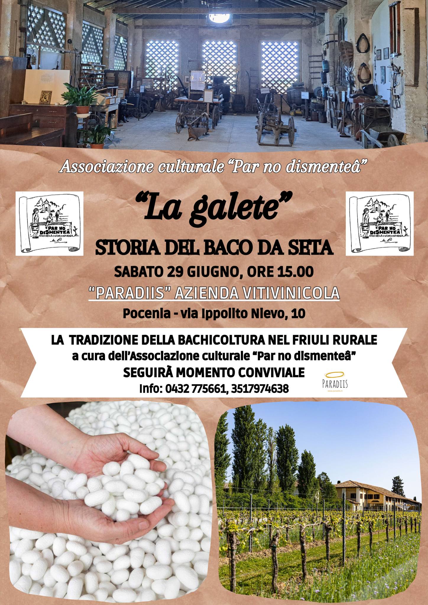 Sabato 29 giugno alle ore 15.00, presso la mostra "Vita e civiltà Contadina friulana" a Paradiso di Pocenia, l'Associazione culturale “Par no dismenteâ” organizza un pomeriggio per raccontare la storia del baco da seta e la tradizione della bachicoltura nel Friuli rurale.