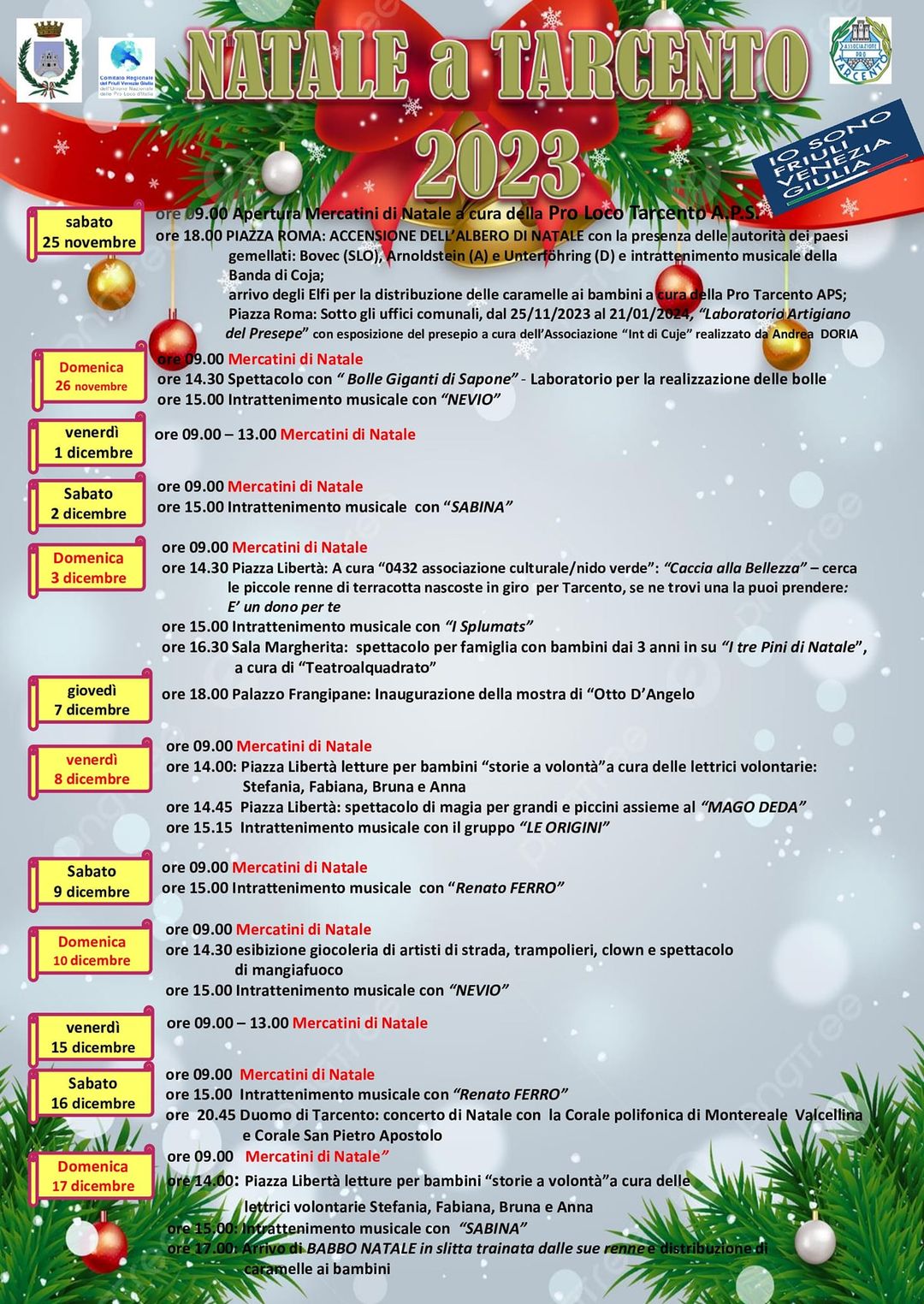 Torna il Natale a Tarcento con i suoi mercatini e tante attività di intrattenimento per grandi e piccini, dall'accensione dell'albero il 25 novembre fino all'arrivo di Babbo Natale il 17 dicembre.